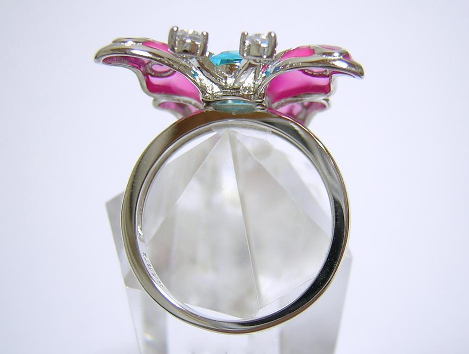 2色のキュービックジルコニアを使用したデザインリングです。 青いキュービックジルコニアの大きさは約8×5.5mmです。 【中石】キュービックジルコニア 【カット】オーバルファセットカット 【脇石】キュービックジルコニア 【重さ】3.9g 【サイズ】11.75号 (お直しは承れません) デザイン部:縦17mm×横20mm 【素材】シルバー925 (14金ホワイトゴールド仕上げ) 【刻印】S925 【状態】新品 ※地金部分に製作時からの微細な小傷やスレがあります。 |