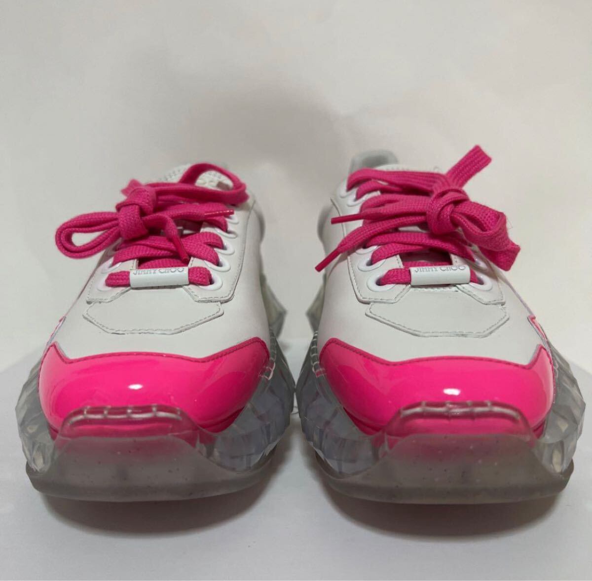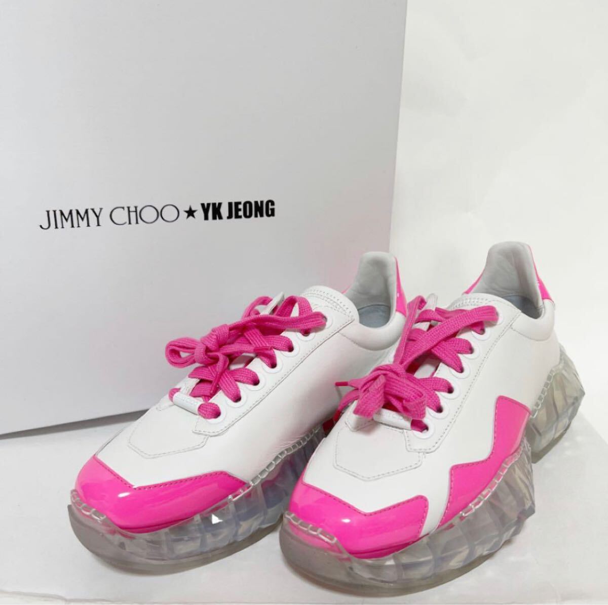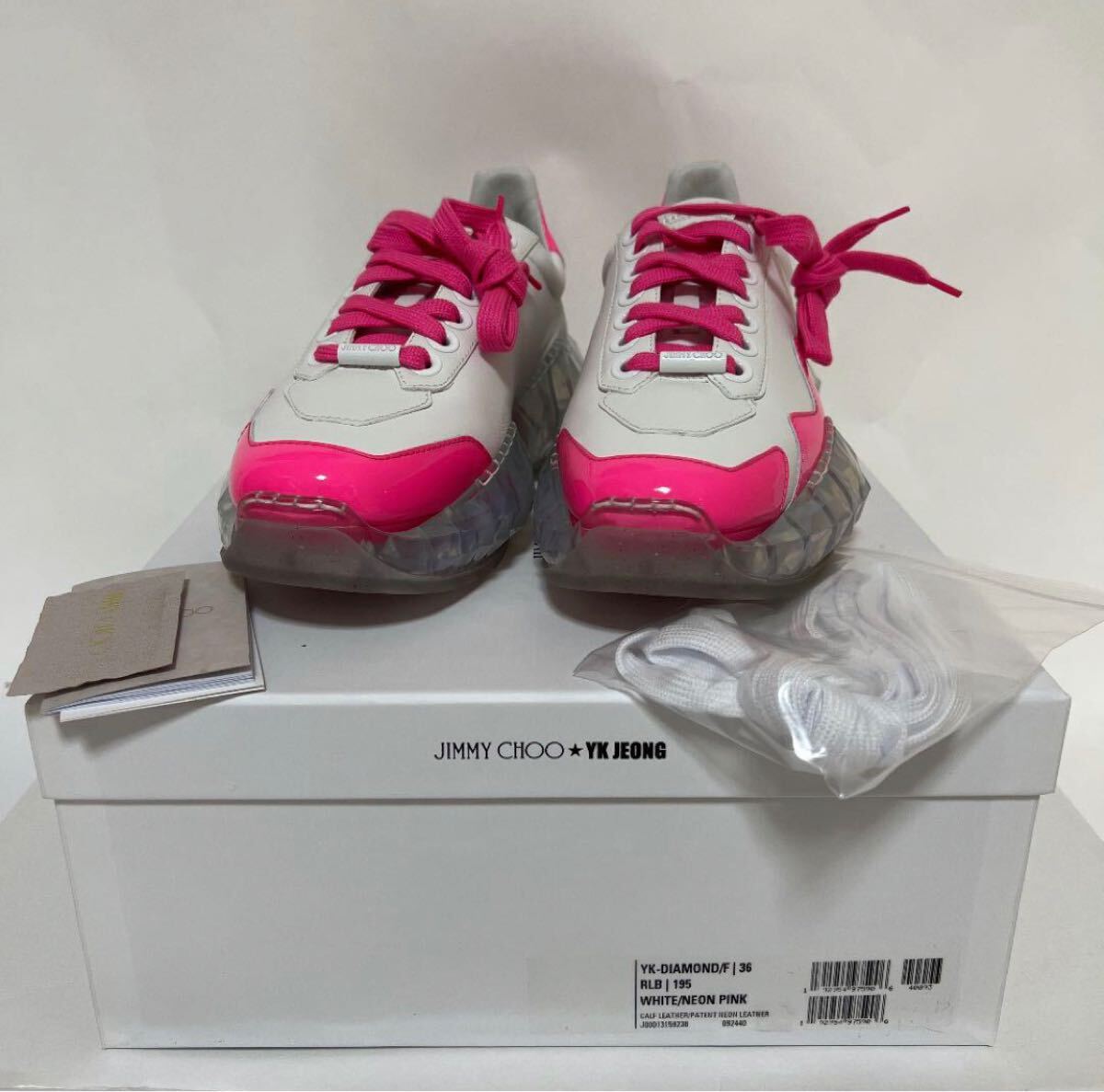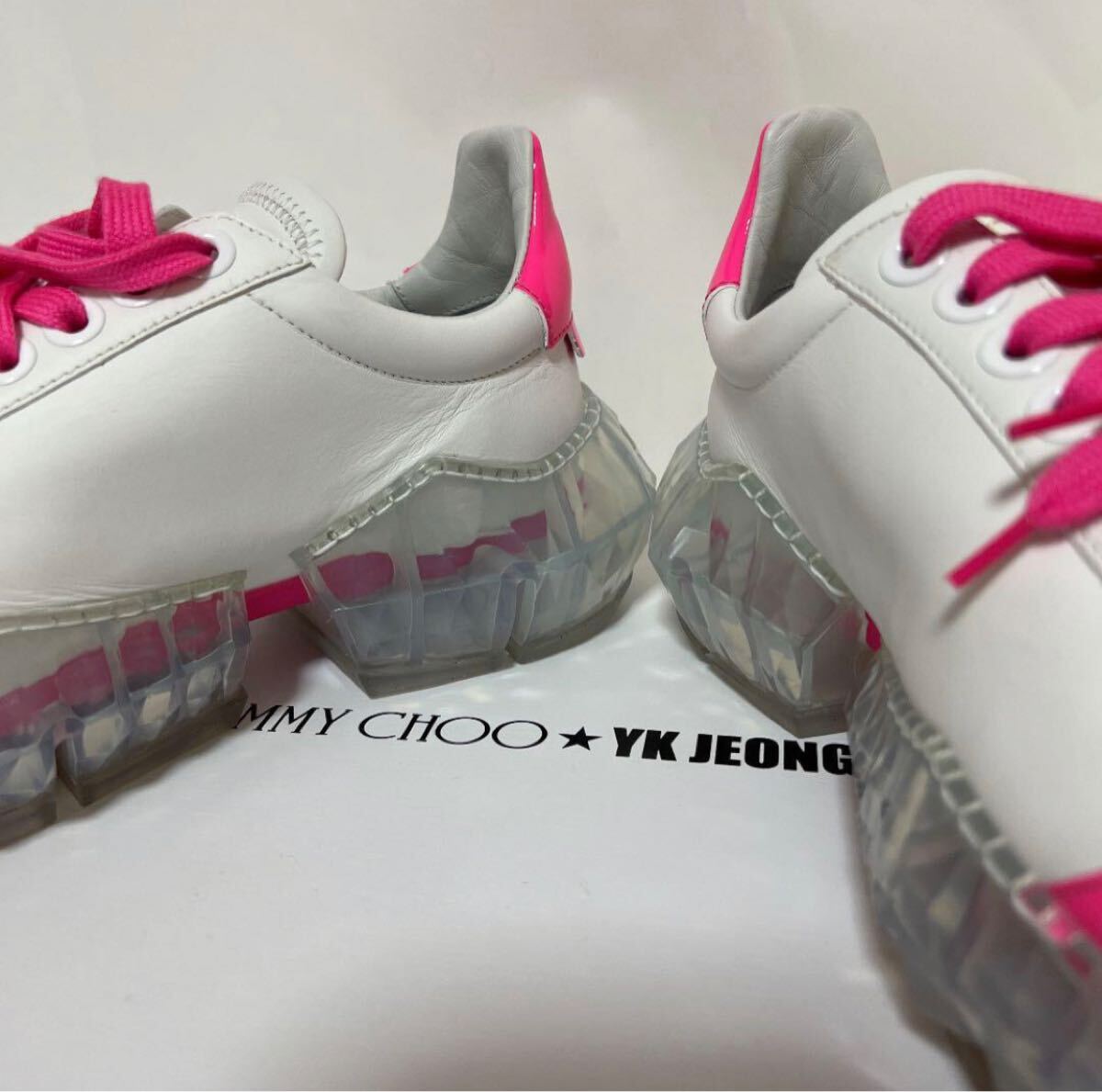 JIMMY CHOO YG JEONG コラボ ジミーチュウ ヨンキージョン レザー ローカット ダット スニーカー ダイヤモンド ネオンピンク 36 中古