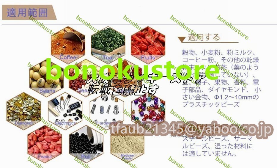 「適用範囲」コーヒー豆、穀物、種子、ダイヤモンド、丸薬、食塩、金物などに適用し、店舗から工場まで幅広くお使いいただけます。使用している素材が適切かどうかわからない場合は、販売者に確認してください。