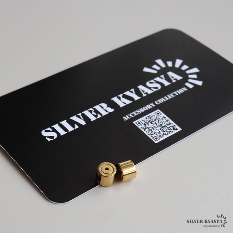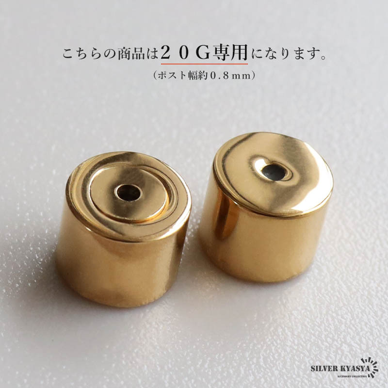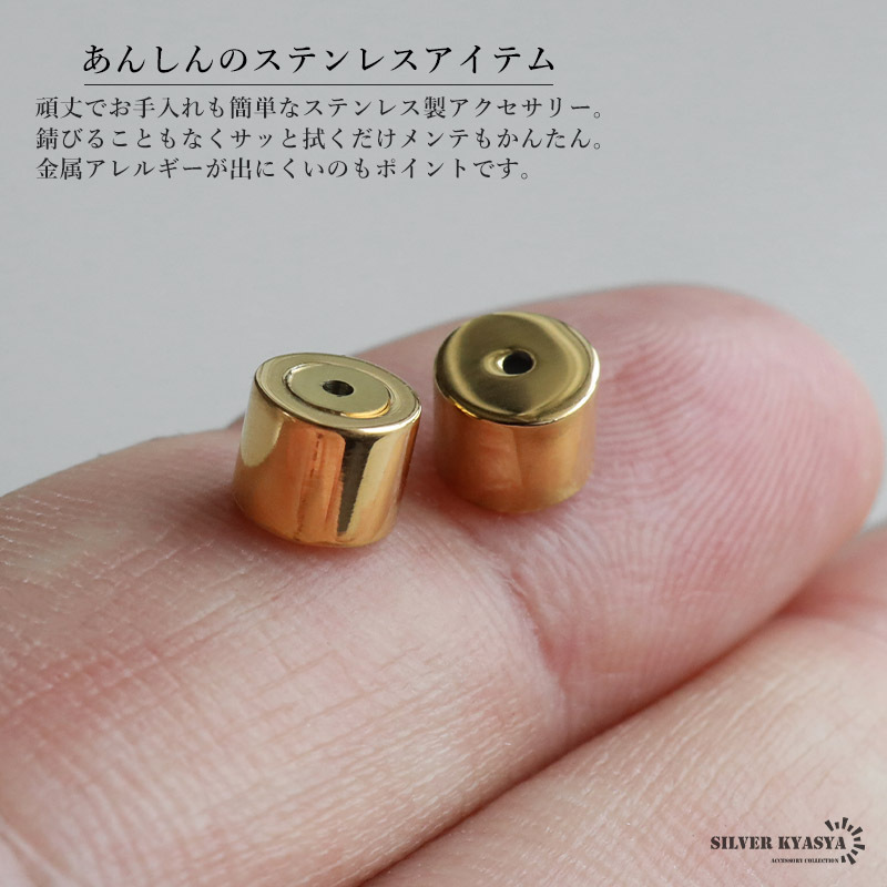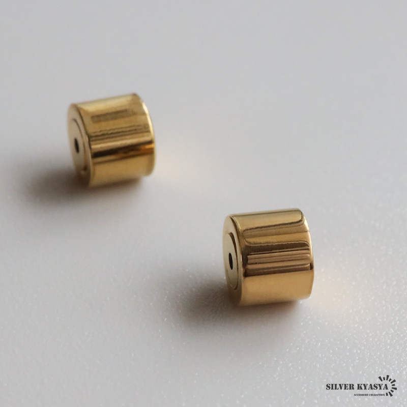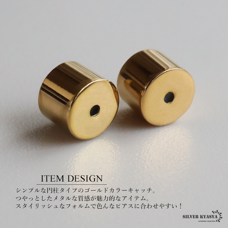 シンプルな円柱タイプのゴールドカラーキャッチ。つやっとしたメタルな質感が魅力的なアイテム。スタイリッシュなフォルムで色んなピアスに合わせやすい!