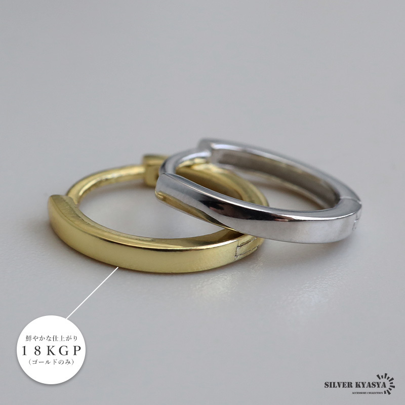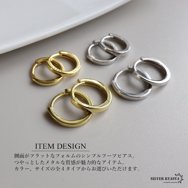 側面がフラットなフォルムのシンプルフープピアス。つやっとしたメタルな質感が魅力的なアイテム。カラー、サイズの全4タイプからお選びいただけます。