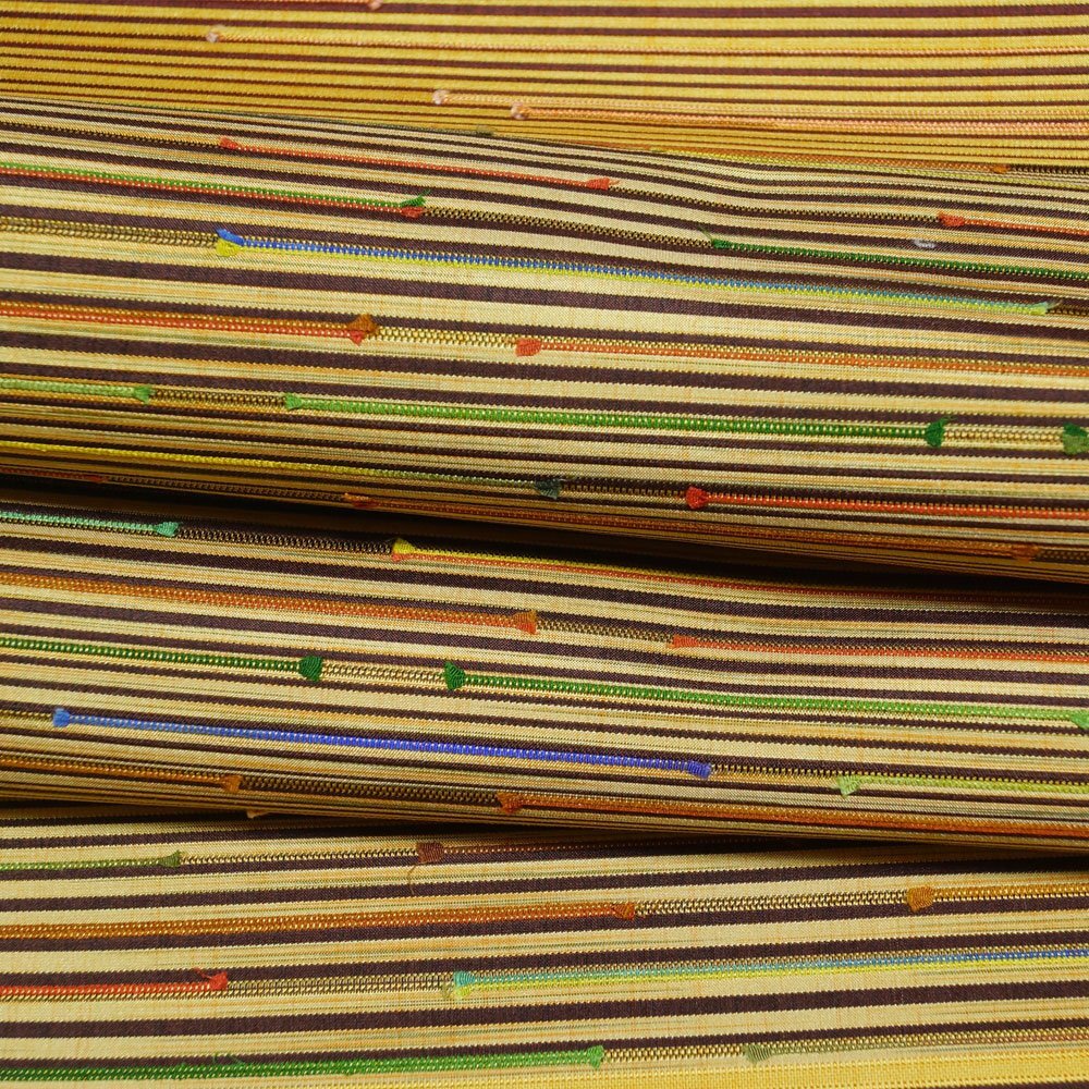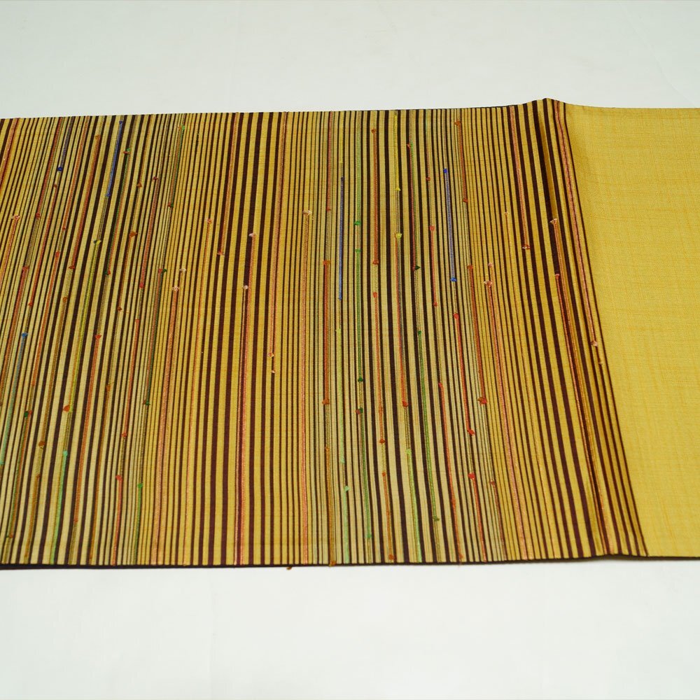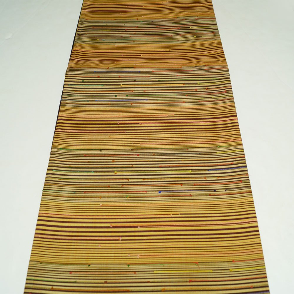 商品 説明 | 蒸栗色・栗皮茶色系の横縞模様の地に太めの色糸で横縞模様が施された洒落袋帯です。 |