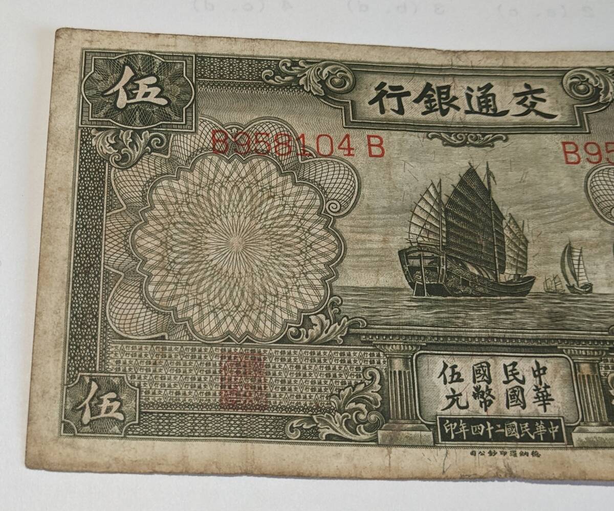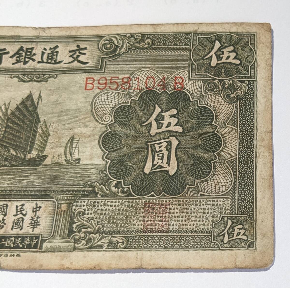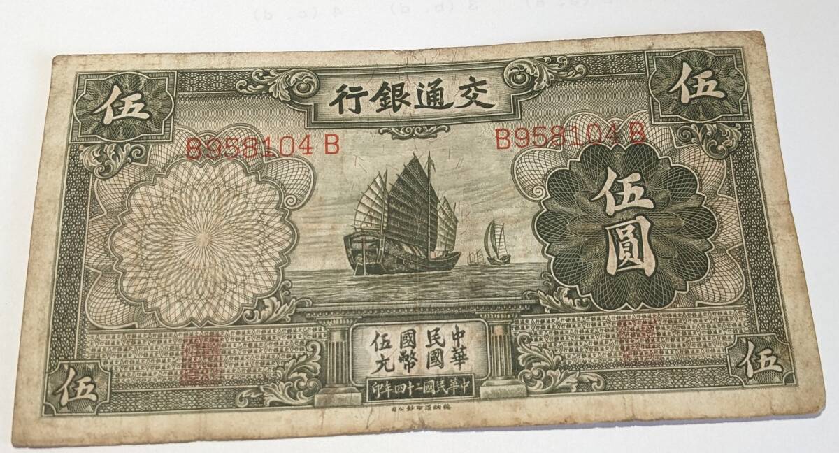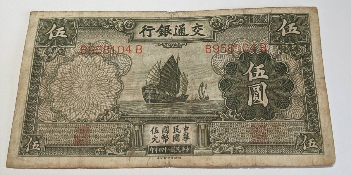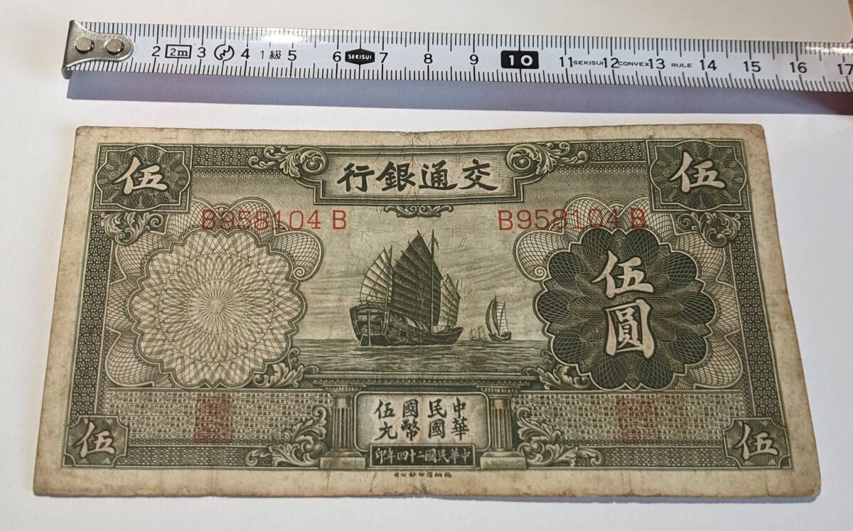 ’1935 中華民国二十四年 伍圓(5円)紙幣 交通銀行 流通品