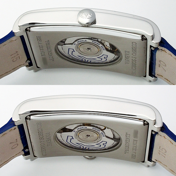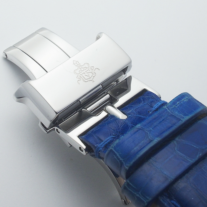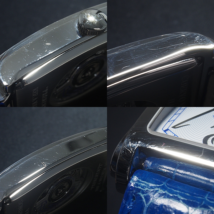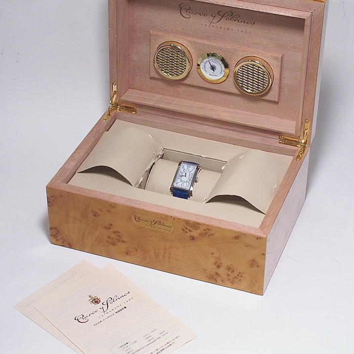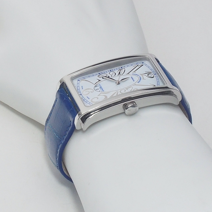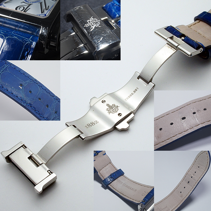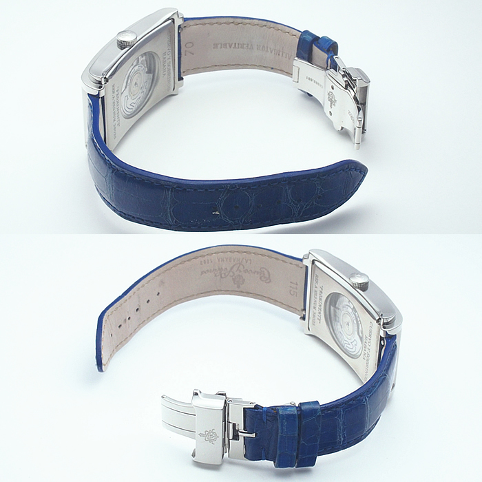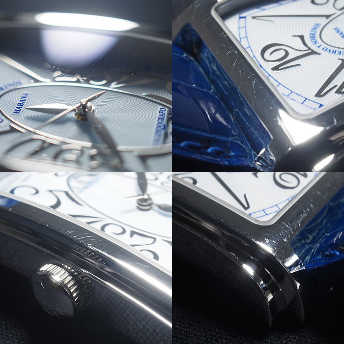 備考:ハバナを代表する葉巻の名を冠し、美しくシェイプされたレクタンギュラーケースが魅力の「プロミネンテ」。ダイヤルにギョーシェ彫りが施された高級感溢れる一本です。バンドにシワ・汚れ・金具跡・穴の広がりがあり使用感がございます。全体的にスレがあり、ガラスコーティング膜にわずかな小スレがございますが、通常使用でお気兼ねなくご使用いただけるお品となっております。