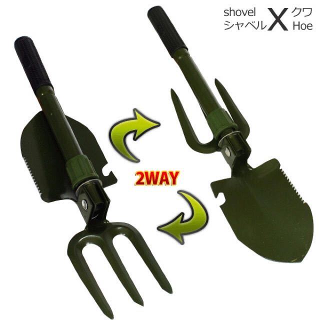 1本で4通りの使い方!折りたたみ式 シャベル&三本クワ 握りやすい 簡易のこぎり・栓抜き 収納ポーチ付 ガーデニング/アウトドア ◇ 2WAYスコップ