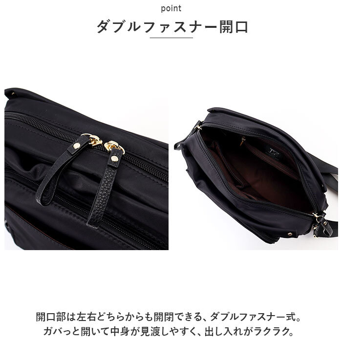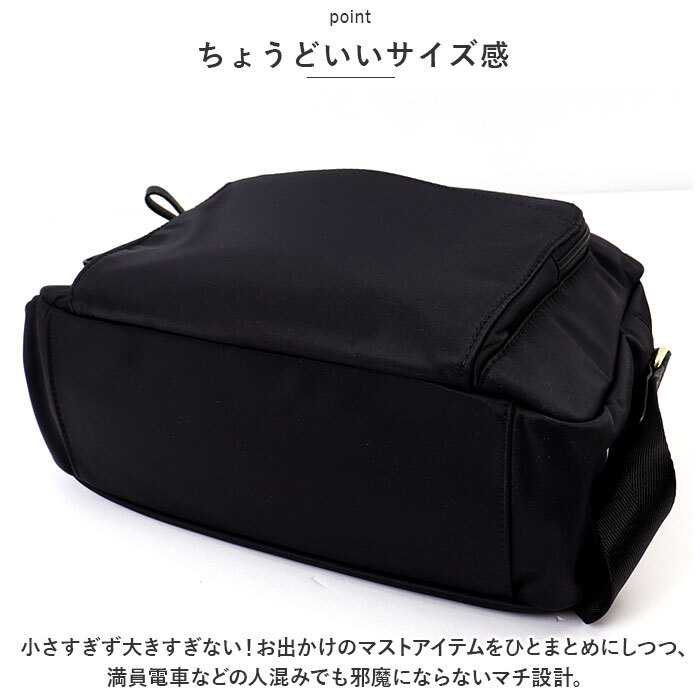 商品説明 | ・・デイリー使いにぴったり。多数のポケットを装備し、荷物がすっきりまとまる「マルチポケットショルダー」が新登場。 ・【落ち着きのあるデザイン】 ・サラッとした質感で程よい光沢感のあるナイロン素材を使用。部分的にフェイクレザーやゴールド金具を取り入れ、カジュアルすぎない仕上がりに。 ・【ちょうどいいサイズ感】 ・小さすぎず大きすぎない!お出かけのマストアイテムをひとまとめにしつつ、満員電車などの人混みでも邪魔にならないマチ設計。 ・【ダブルファスナー開口】 ・開口部は左右どちらからも開閉できる、ダブルファスナー式。ガバっと開いて中身が見渡しやすく、出し入れがラクラク。 ・【A5サイズ対応】 ・内側はA5サイズのノートが横向きにすっぽり。長財布やペットボトルなども収納でき、使い勝手ばっちり。 ・【充実の10ポケット仕様】 ・内側・外側合わせて10個のポケットを装備。小物が迷子になりにくく、必要な時にすぐに取り出しOK。 ・【使い心地軽やか】 ・サッと持ち出せる軽量なつくり。体に負担がかかりにくく、長時間の移動もストレスフリー。 ・【持ち方をアレンジ】 ・ショルダーの長さを調節して、肩掛けも斜め掛けもお好みで。ショルダーは肩に食い込みにくい幅広仕様。 ・【ちょっとの雨なら大丈夫】 ・表面に水滴や汚れを弾く撥水加工済みで、お手入れも拭き取るだけ。(※完全防水ではありません。) ・【選べるカラー】 ・コーデを選ばず使いやすいカラーをラインナップ。シーズン問わず、ヘビロテ間違いなし♪ ・【ポケット仕様】 ・内側:ファスナーポケット×2、オープンポケット×3 ・前面:マグネットポケット×1、ファスナーポケット×1、オープンポケット×1 ・背面:マグネットポケット×1、ファスナーポケット×1 |