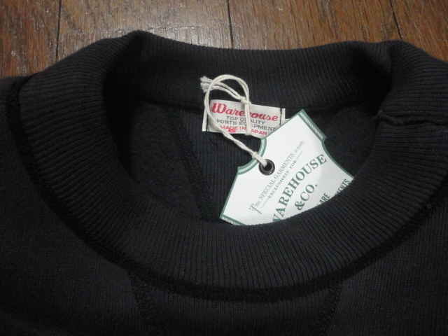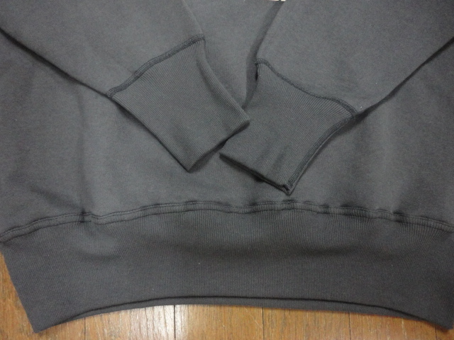 。カットソーがウールからコットンに変わった1930年代からある挟み込み仕様の腰リブ。首まわりには伸縮に富むV字のフライスを前後に配した四本針仕様のスウェットです。肩口から垂直に落ちる袖口のセットインスリーブはややソリッドな印象を受けるシンプルなデザインですが、腰帯のバインダー仕様は着込むほどにアタリが生まれます。