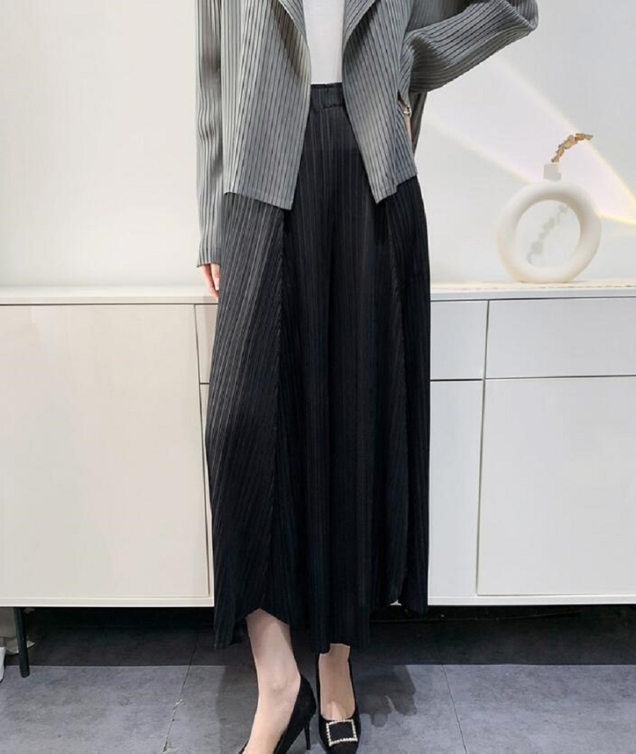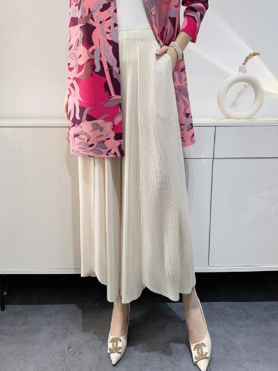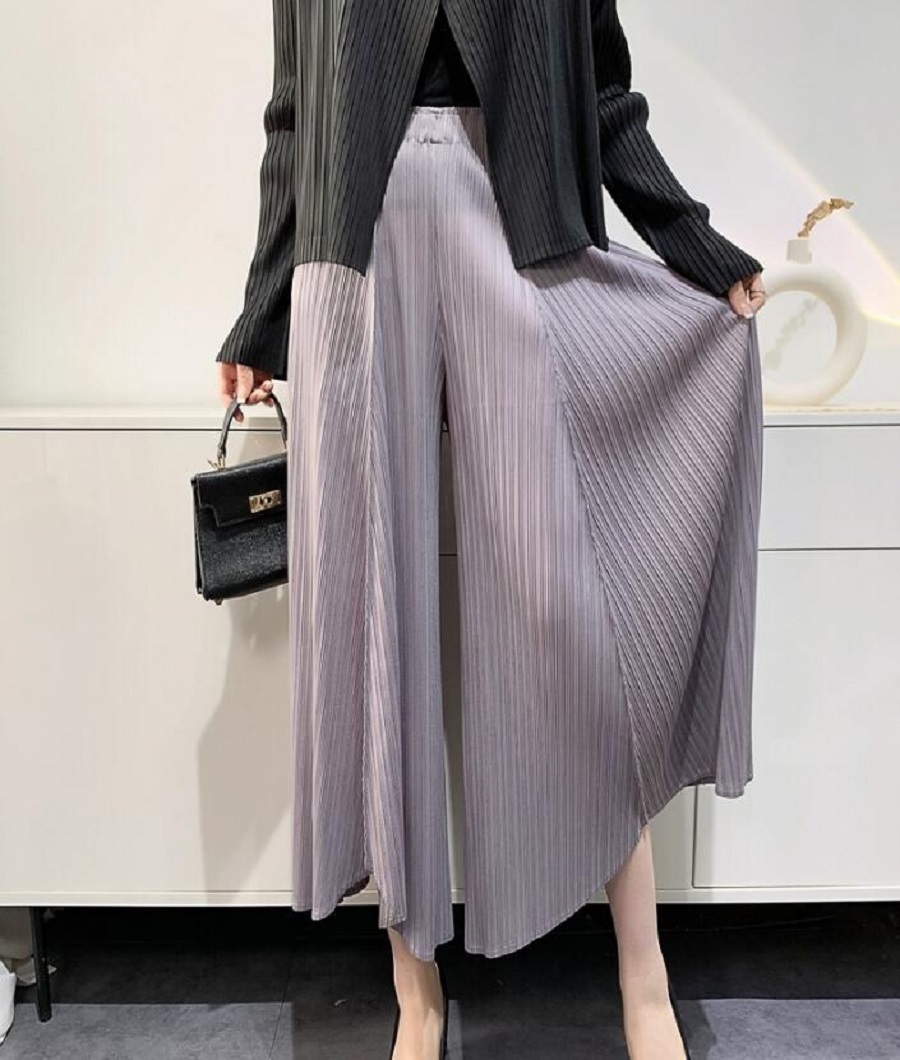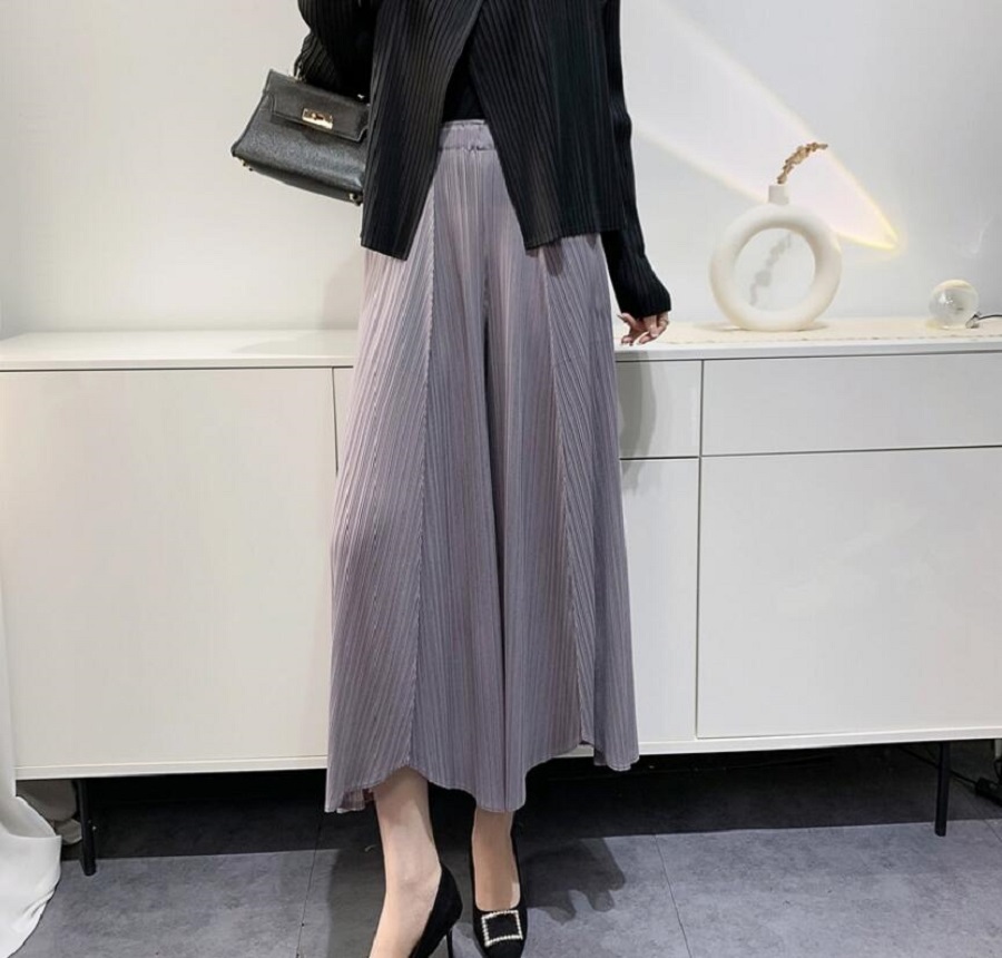 同梱1万円送料無料」レディースプリーツpleatsワイドパンツズボン弾力が肌触りドレープ性がいいポケット付き裾広がる大人可愛いグレー