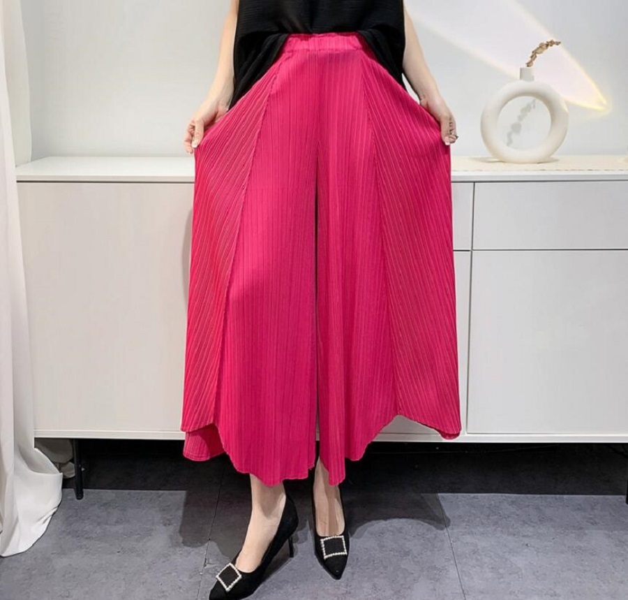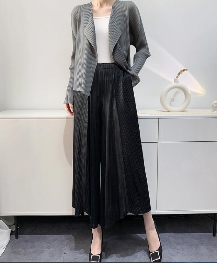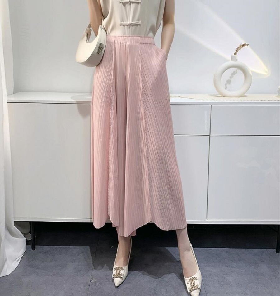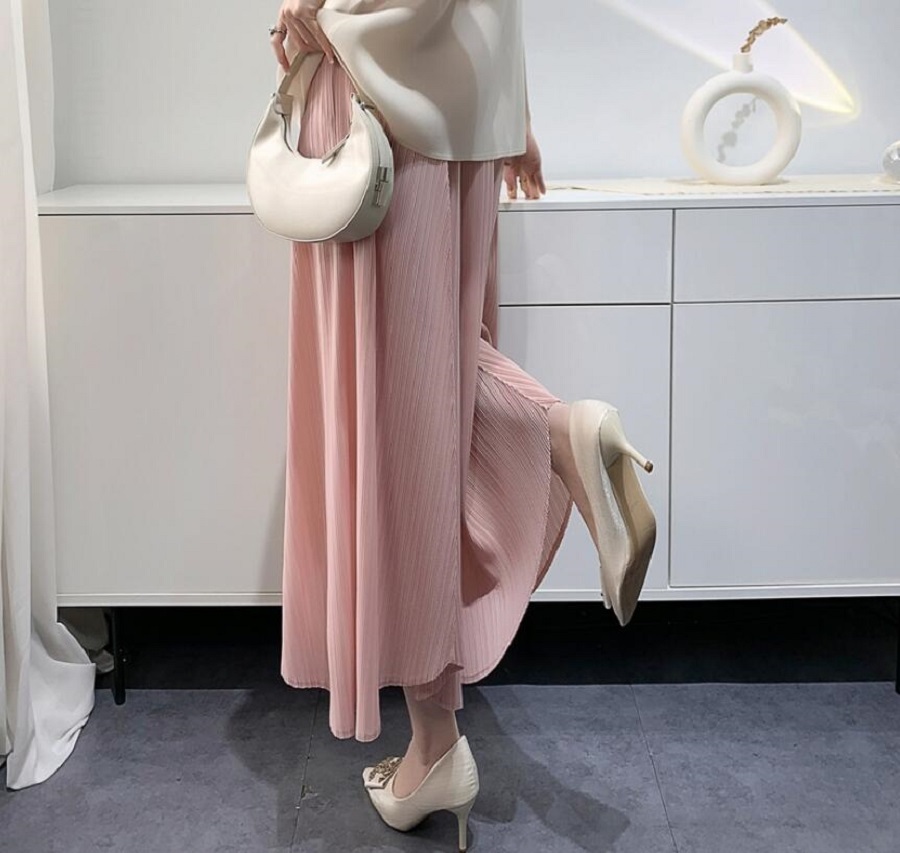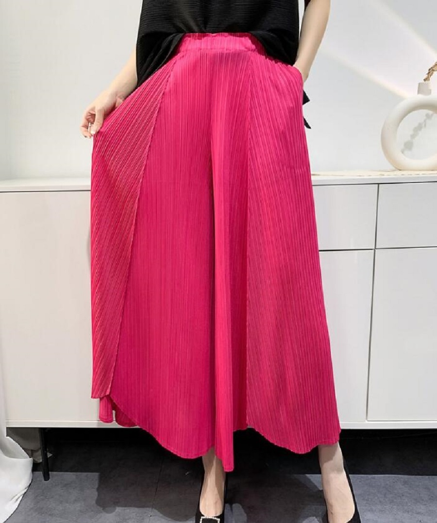 同梱1万円送料無料」レディースプリーツpleatsワイドパンツズボン弾力が肌触りドレープ性がいいポケット付き裾広がる大人可愛いグレー