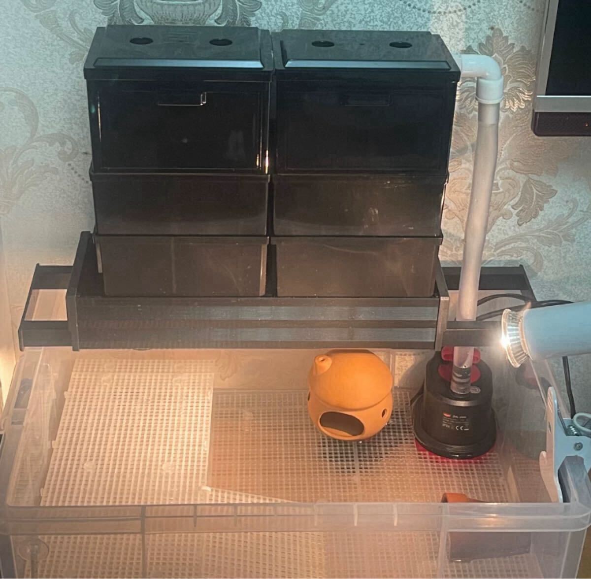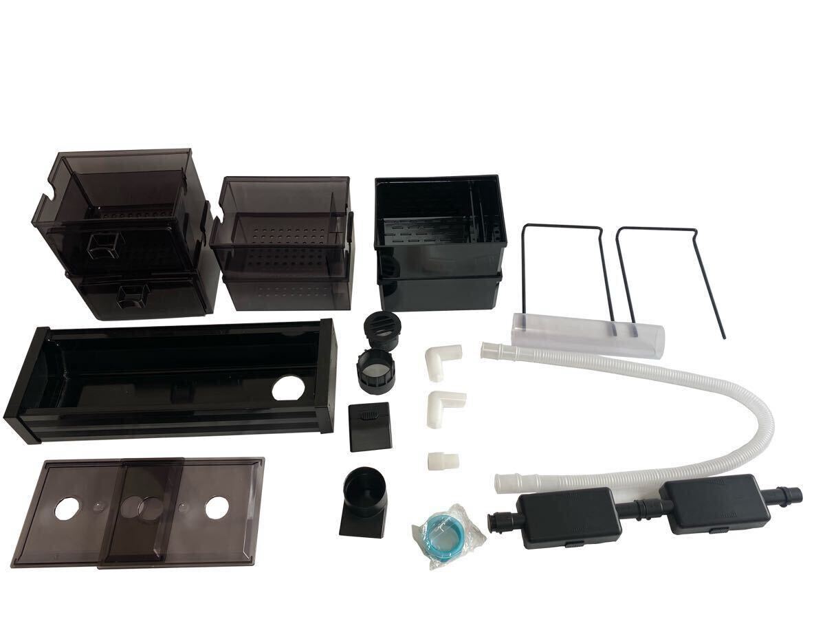 商品では三段階濾過(上は物理濾過、真中は生物濾過、下沈澱槽)2層トリクルフィルターはオールインワンフィルターです。 濾過槽の上層は物理濾過層で、濾過マット入れます
