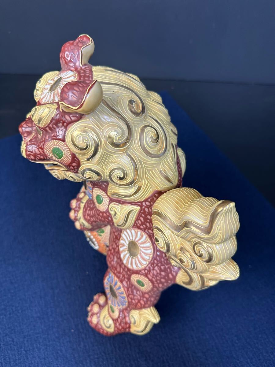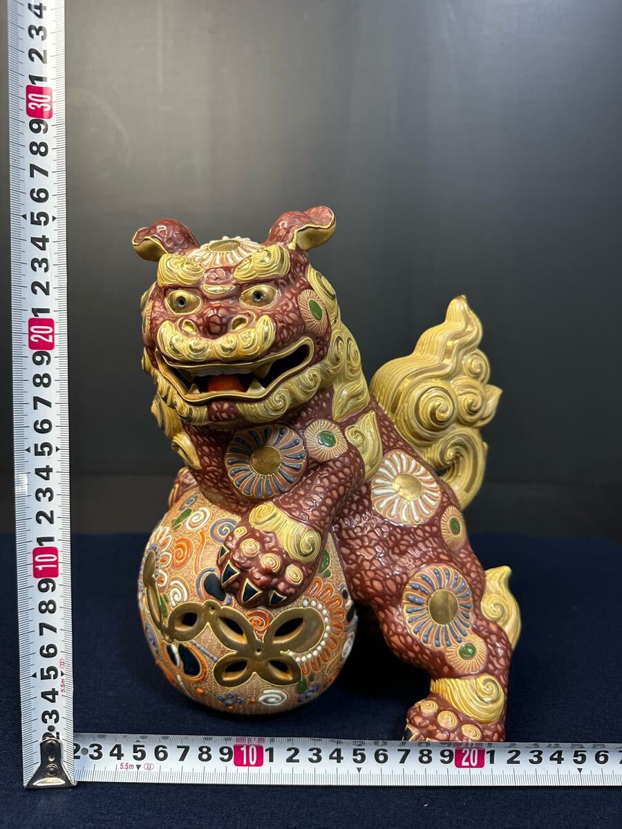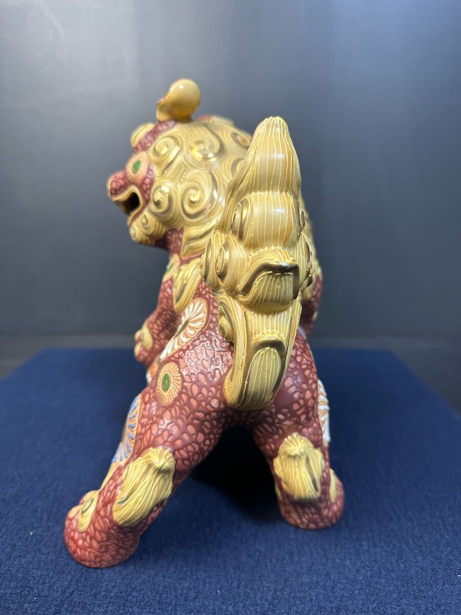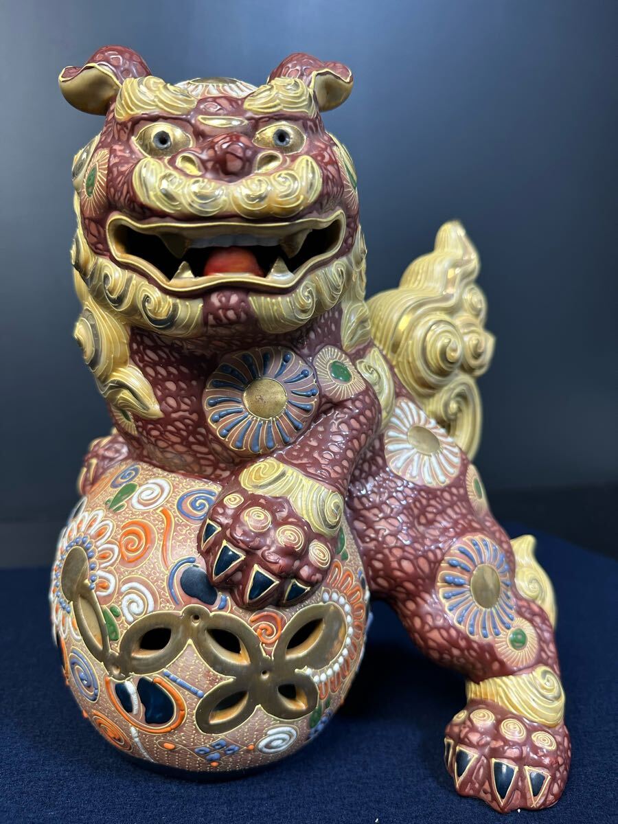 [B587] 九谷焼 玉乗り獅子 置物 縁起物 魔除け 狛犬 玉獅子 陶器 唐獅子