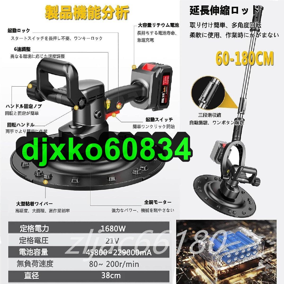 【6速調整可能】この電動左官マシンは1~6段階の速度調整が可能で、速度を自由に制御でき、さまざまな環境に適しています。異なる作業条件に応じて異なる速度を選択し、自由な制御、より安全より便利な構築。 【大容量バッテリー】大容量バッテリーを搭載したワイヤレスリチウムバッテリーは、バッテリー寿命が長く、車と同型のリチウム電池、バッテリー寿命は従来のそれより30%長くなります。施工がしやすく、長く使えます。効率的な熱放散、回転熱放散技術、多孔質熱放散により、モーターを焼損から保護します。低温環境下でも使用可能です。電池寿命は通常の電池に比べて数倍長持ちします。市場で販売されているバッテリーよりも長寿命で高効率です。 【取り外し可能な延長ロッド】高所で作業する必要がある場合は、付属の延長ロッド アクセサリを使用してください。 かがむ必要がなく、腰への負担を軽減。 快適なグリップのための人間工学に基づいた滑り止めハンドル。 両手操作で作業疲労を軽減し、作業スピードアップ。三段伸縮、伸縮距離60-180CM。 【作業効率の向上】充電式トロウェルモルタルやセメントの凹凸を簡単に取り除き、広い面積でコンクリートの床を平らにすることができます。作業効率をスピードアップし、時間と労力を節約し、作業結果の品質を向上させます。この製品は、他の研磨機のさまざまな直径 38cm アクセサリーにも適しています。 【幅広い用途】多目的、各種中粘度液の混合に適し、セメント、コンクリート、グラウト、泥、ペンキ、モルタルなどを含む。 乾式壁研磨機は、手が届きにくい外壁、廊下、接着剤、パリの漆喰など、内外壁、天井、四面壁、天井の滑らかで粗い表面に適しています。 建設作業、プロの建設チーム、または民家の改築に役立ちます。