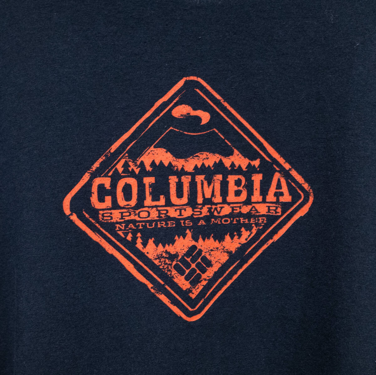 【商品】 Columbia SPORTSWEAR コロンビア コットン 半袖 Tシャツ 前面 グラフィック TEE デザイン プリント ダーク ネイビー 濃紺 アウトドア 古着 オーバーサイズ