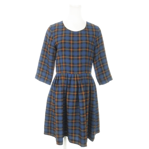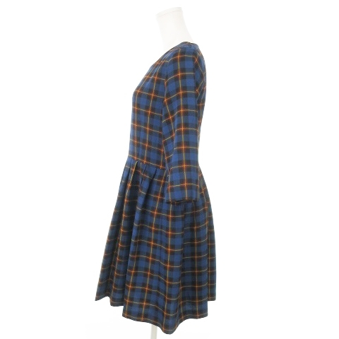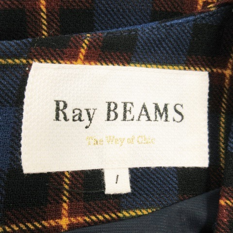 レイビームス Ray Beams ワンピース ミニ 七分袖 切替 プリーツ チェック 総柄 ハリ感 1 青 ブルー /AO7 レディース