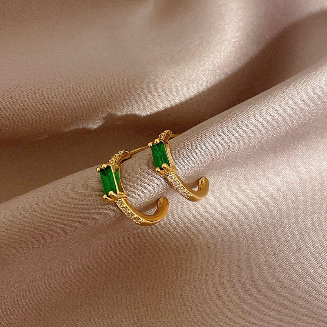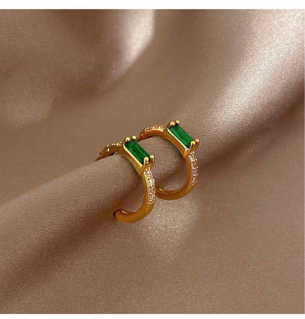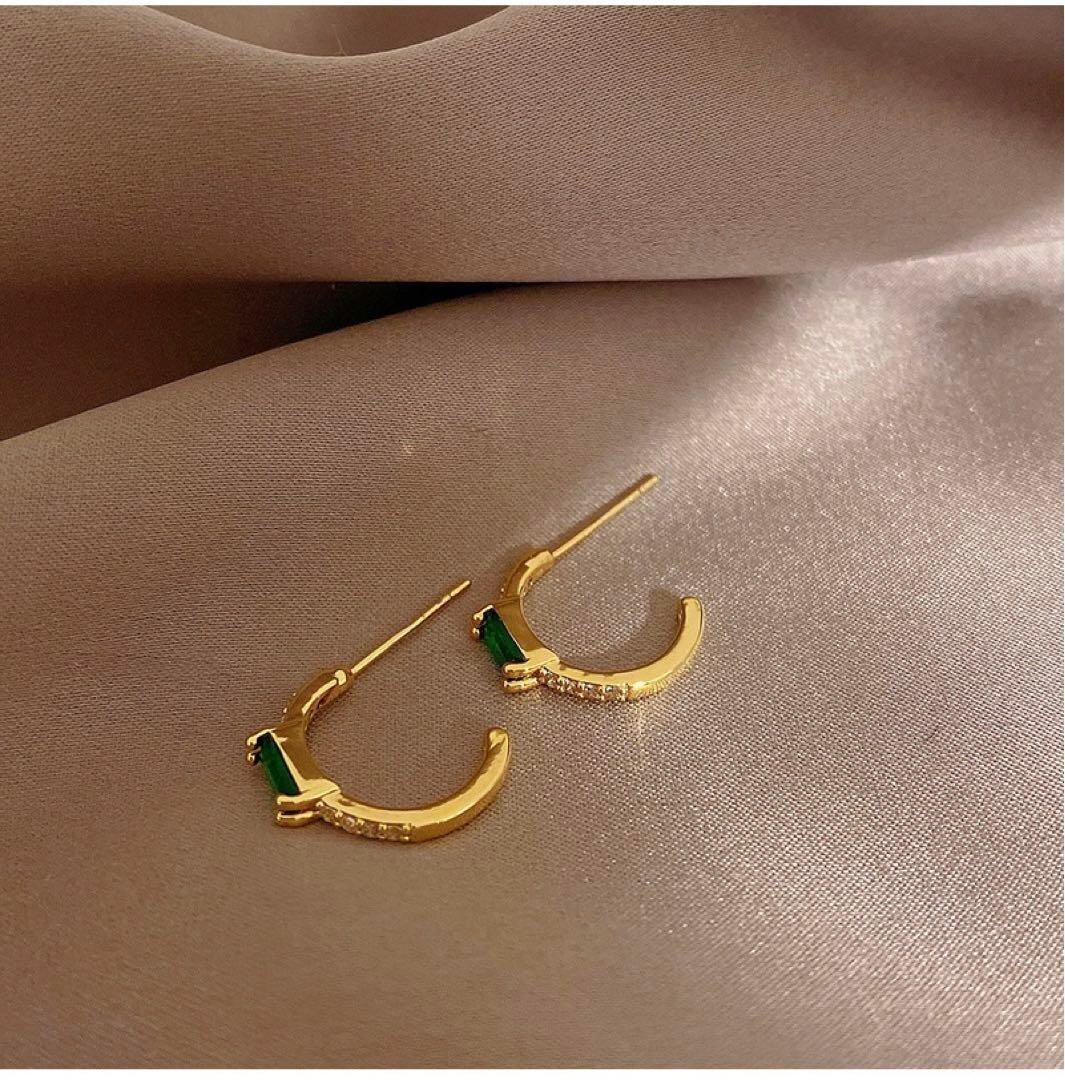 このピアスは、合金の素材で作られ、緑色の石と小さなラインストーンの装飾が施されています。デザインは半円形で、シンプルながらもエレガントな印象を与えます。