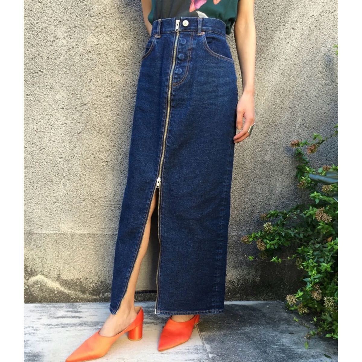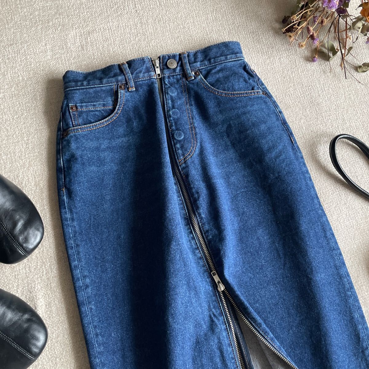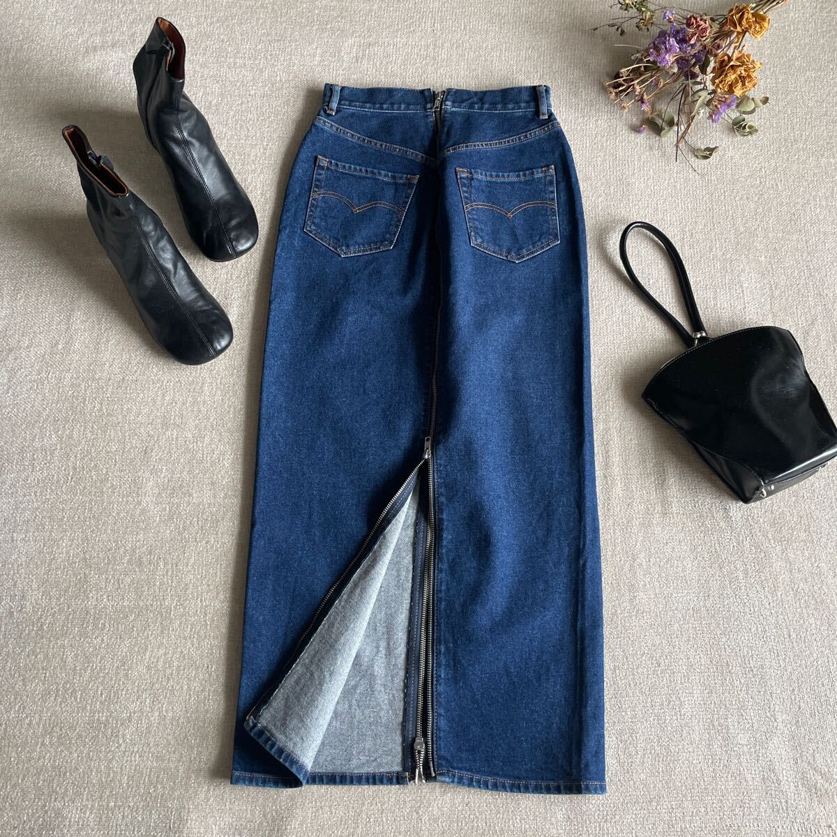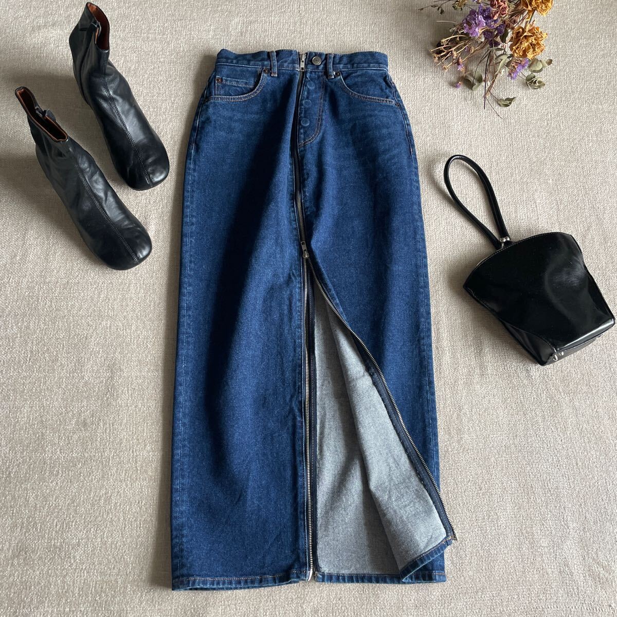 長いジップが前後についた特徴的なロングデニムスカート。岡山の工場で加工にこだわった1枚。ストレッチが入っているので、動きやすくタイトに履きこなせます。