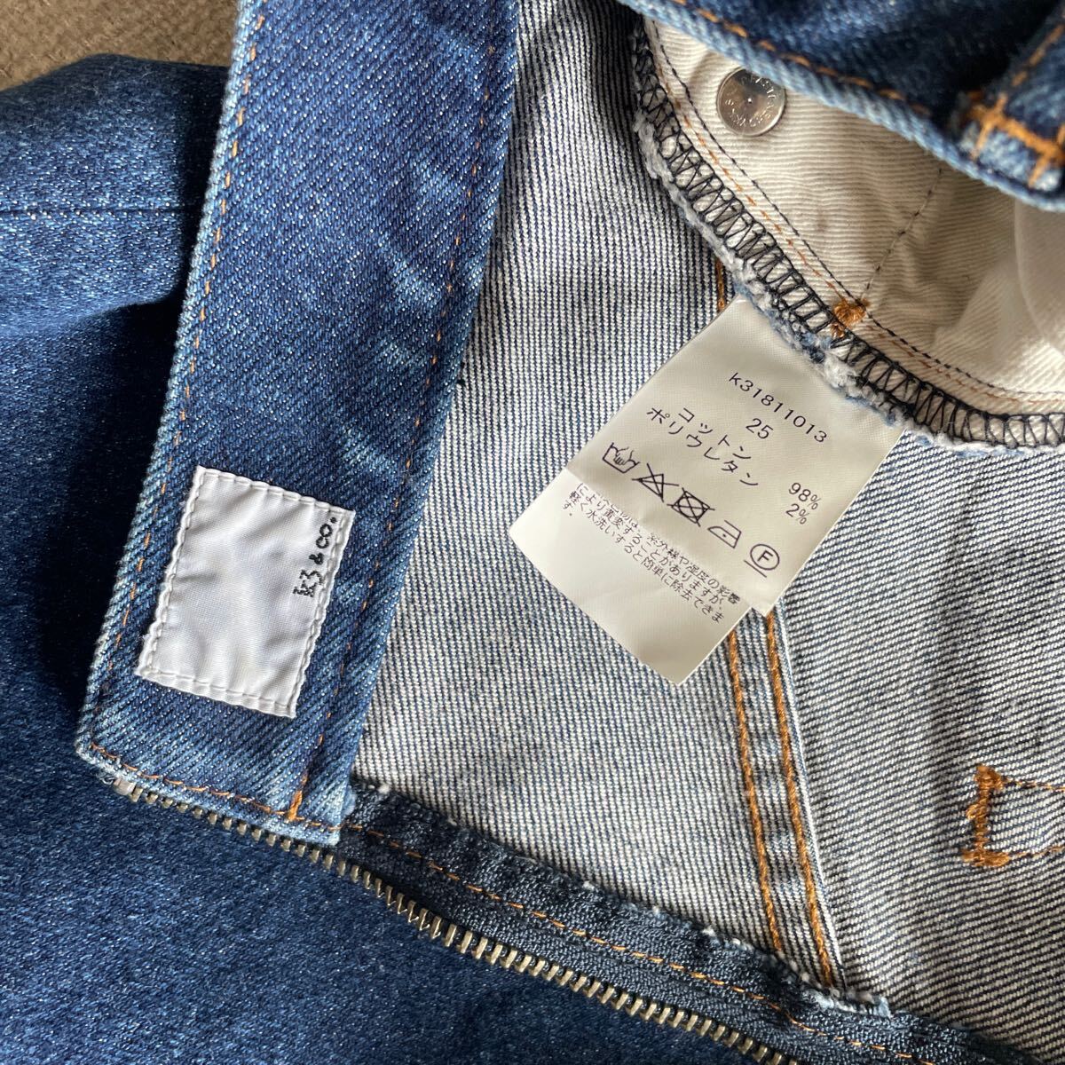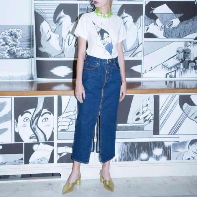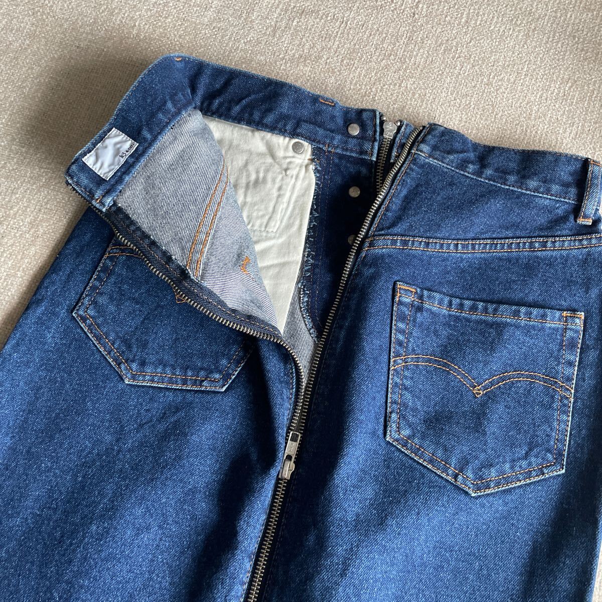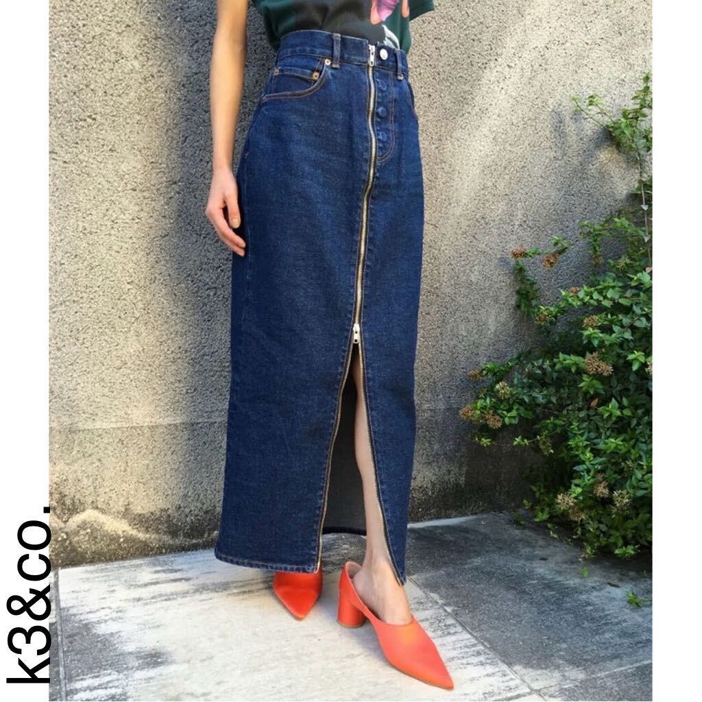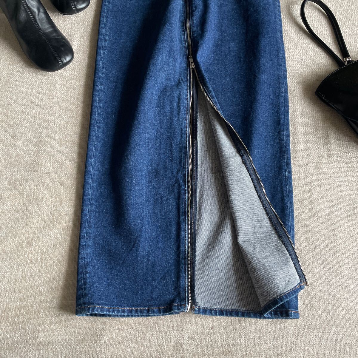 長いジップが前後についた特徴的なロングデニムスカート。岡山の工場で加工にこだわった1枚。ストレッチが入っているので、動きやすくタイトに履きこなせます。