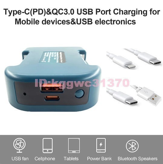 [USBポートとType-Cポート]出力1:Type-C、PD。(iPhone Lightning への USB C ケーブル。ただし、USB-C は USB-C には適合しません); 出力 2: USB/QC3.0。現場でマキタ 18V リチウムイオン LXT スライド バッテリ (別売り) と併用して、小型充電します。 AC 電源が利用できない場合は、電子デバイス (スマートフォン、MP3、MP4、カメラ、iPad、iPhone タブレット、その他の USB デバイス) を使用できません。