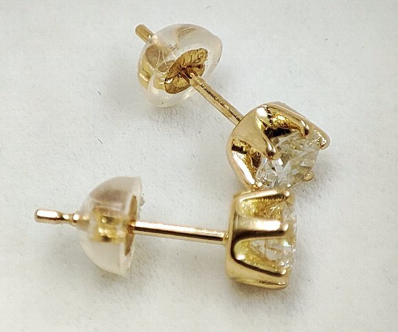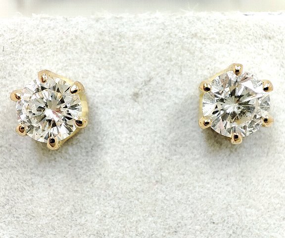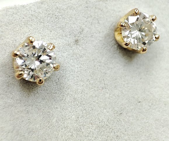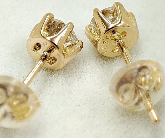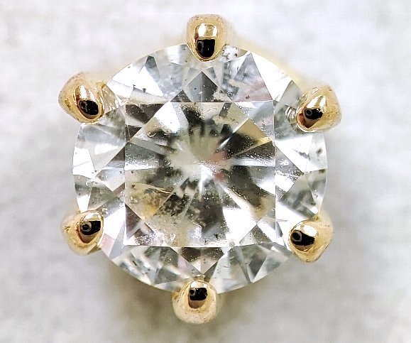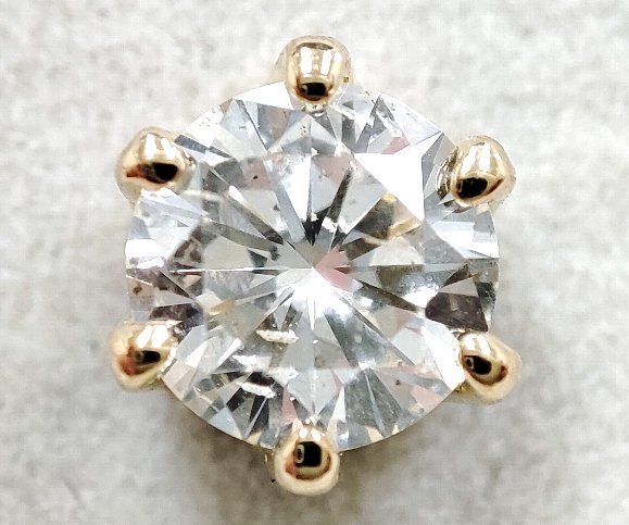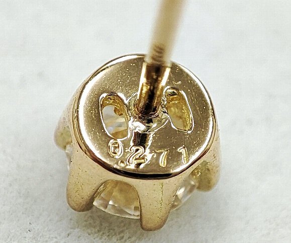 0.27カラット 0.271カラットの天然ダイヤモンドを 6本爪のティファニータイプの石座枠に石留めしています。素材は、18金イエローゴールドでピアス針の太さは、0.6ミリです。 天然ダイヤモンドのクラリティは主観になりますが、SI クラスから I クラスになるかと思います。輝きは強く綺麗です。 |