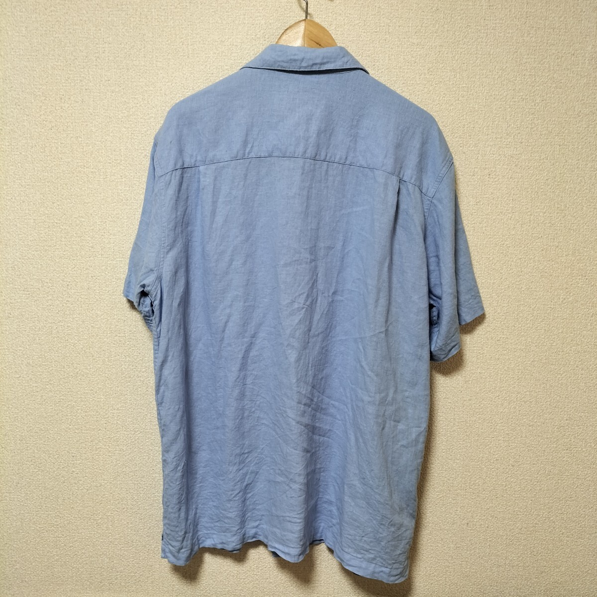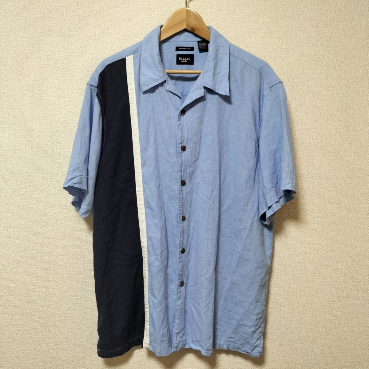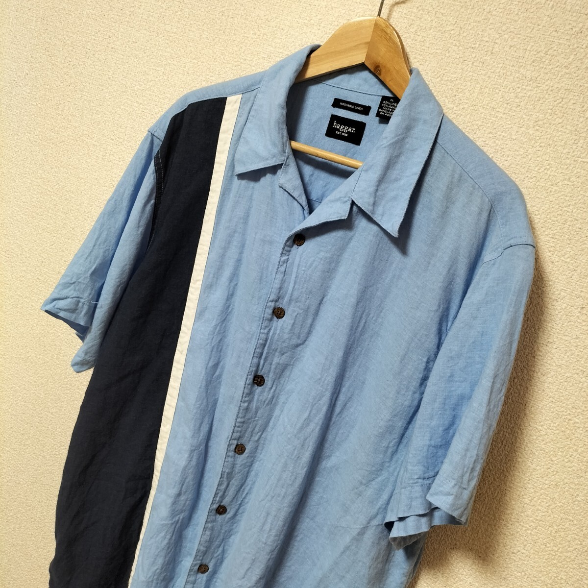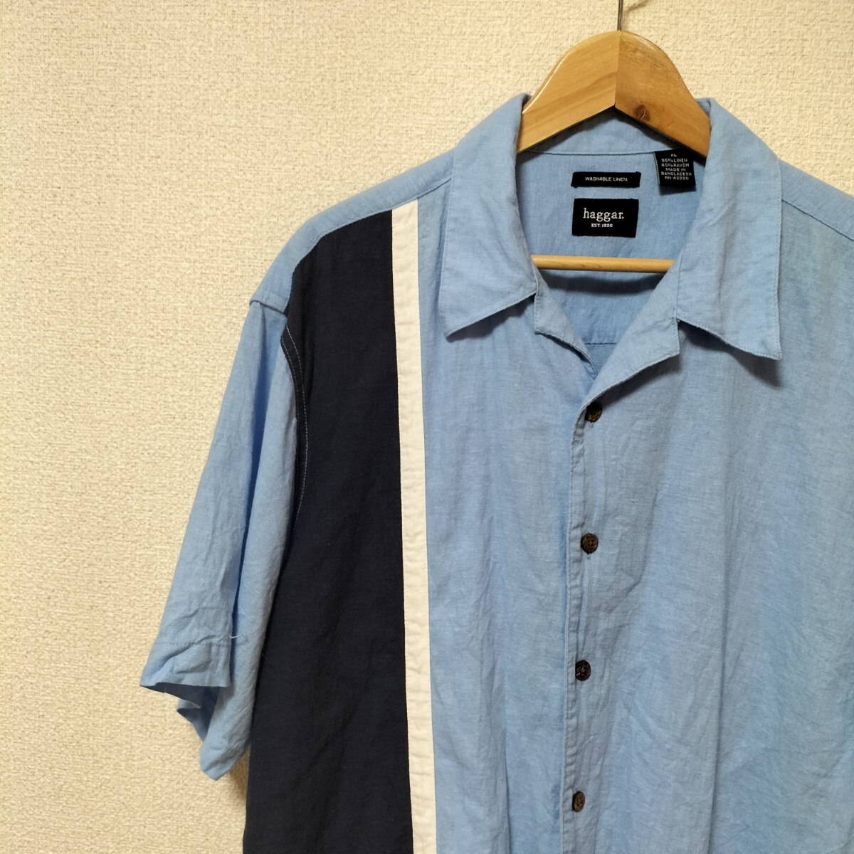 ☆90s haggar リネン レーヨン オープンカラー 開襟 半袖 シャツ トップス ライトブルー 水色 青系 ライン メンズ サイズXL ヴィンテージ オールド ハガー ブランド 古着 USED