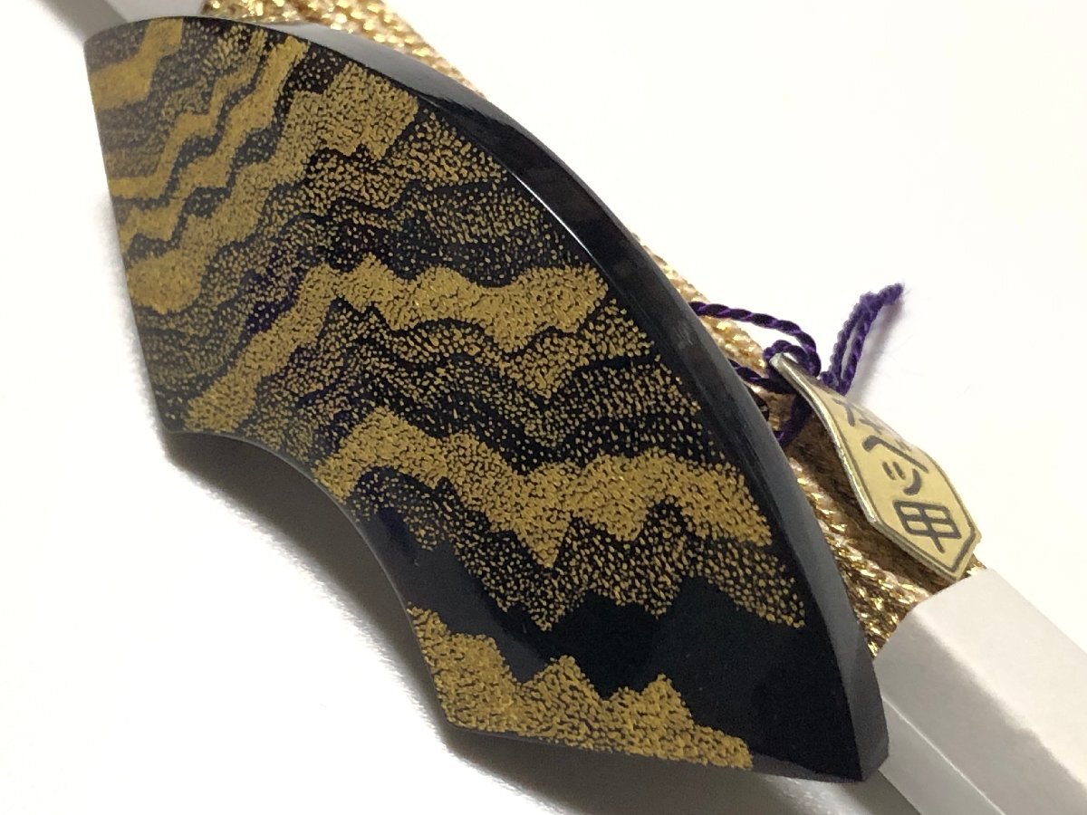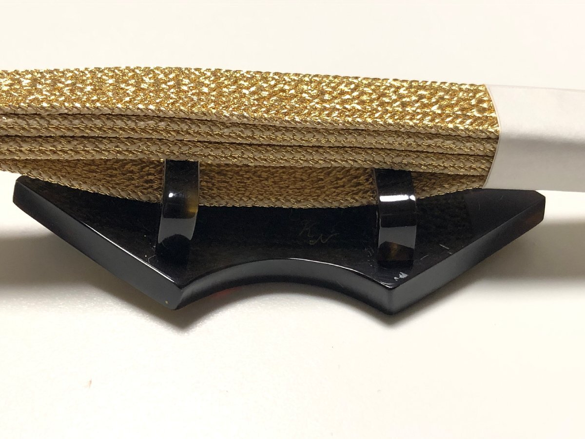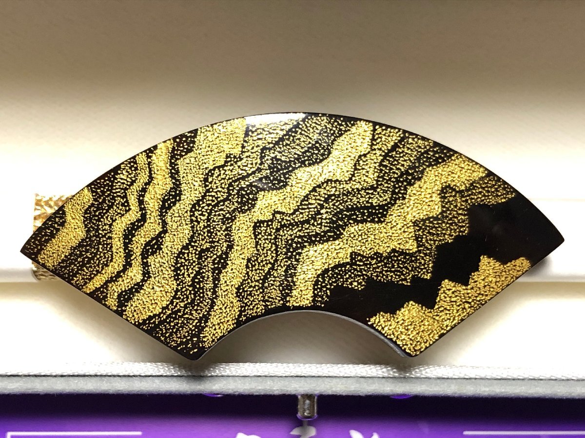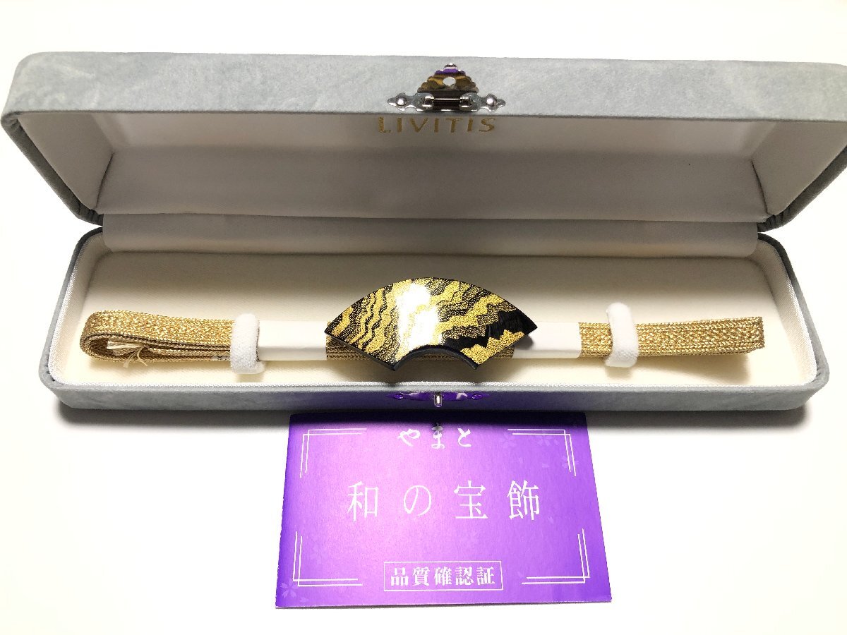 アンティーク、きものやまとの本鼈甲を使用し、漆塗り、沈金加工を施した、デザイン扇形帯留めと帯締めです。作者、西勝廣の『K.N』の刻印があります。未使用品、鼈甲部分に欠けや虫食いは無く、状態良好です。ケース付属です。