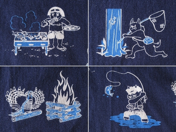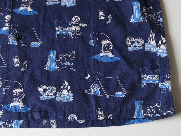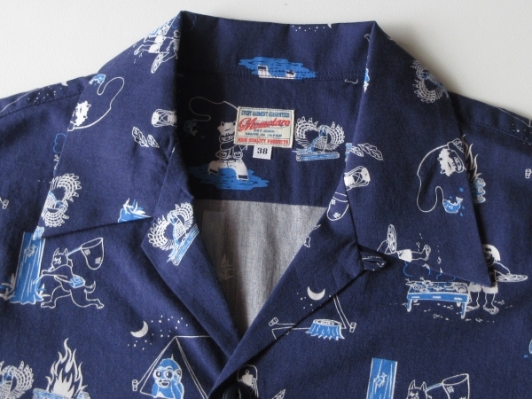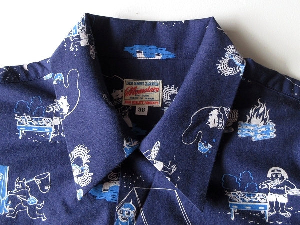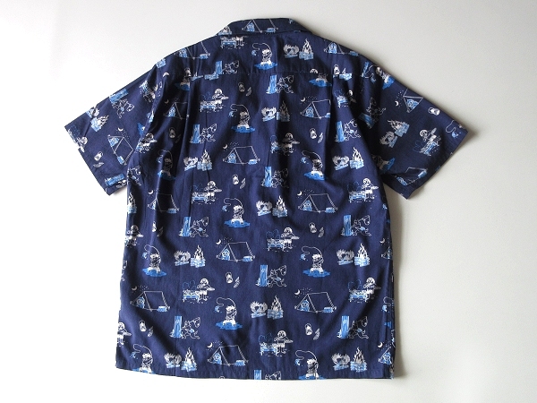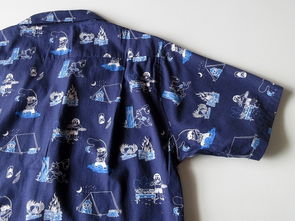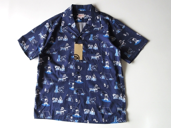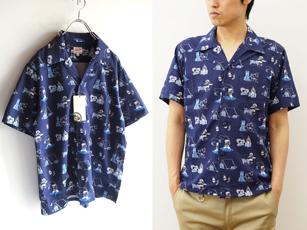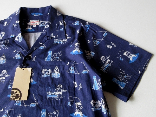 新品タグ付 MOMOTARO JEANS 桃太郎ジーンズ 2021SS 猿/雉/犬/鬼 キャンプ柄 開襟 ハワイアンシャツ アロハシャツ 38 ネイビー ネコポス対応