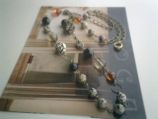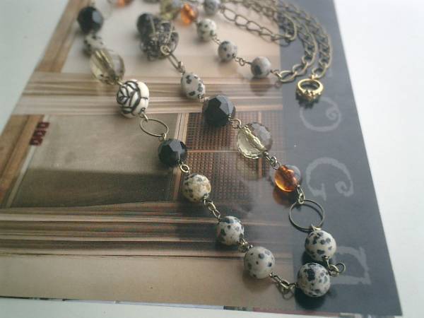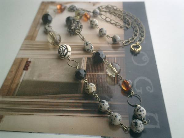 シックな薔薇・・シリーズです♪ジャスパーと薔薇・・キュートなダルメシアンジャスパーのネックレスです♪丸玉やタンブルのダルメシアンに琥珀色やモスグリーンのデザインビーズやワイヤーボールや樹脂薔薇を合わせて大人のロマンチックしています♪ジャスパーは8ミリ、10ミリの丸玉、15ミリ位のタンブルです♪長さは全長92センチ位で調節自由です♪2連にされても素敵です♪お揃いのブレスレットも出品しています♪シンプルで飽きのこないいつまでも着けられるデザインを考えて作りました♪ハンドメイドをご理解頂いてノークレーム、ノーリターンでお願いします