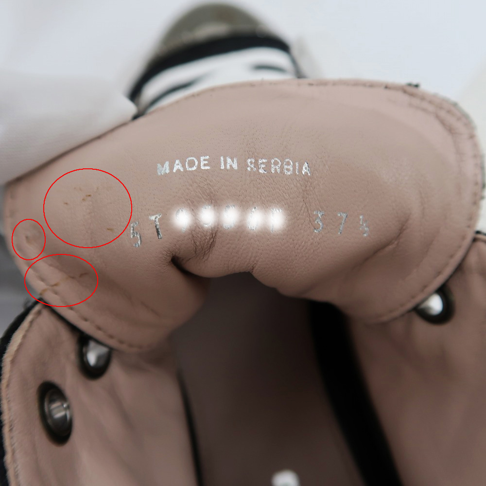 ベロ裏部分にも少々汚れがあり、サイドの白いソール部分にはべたつき感が少々御座います。