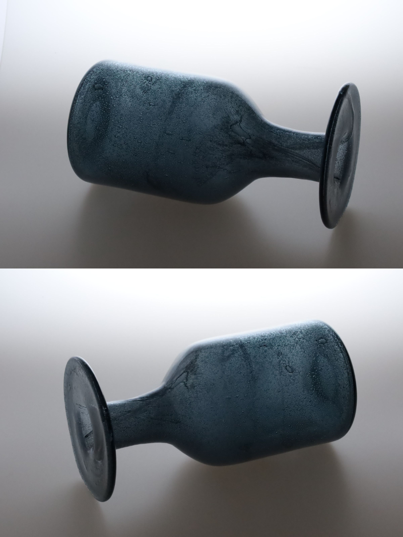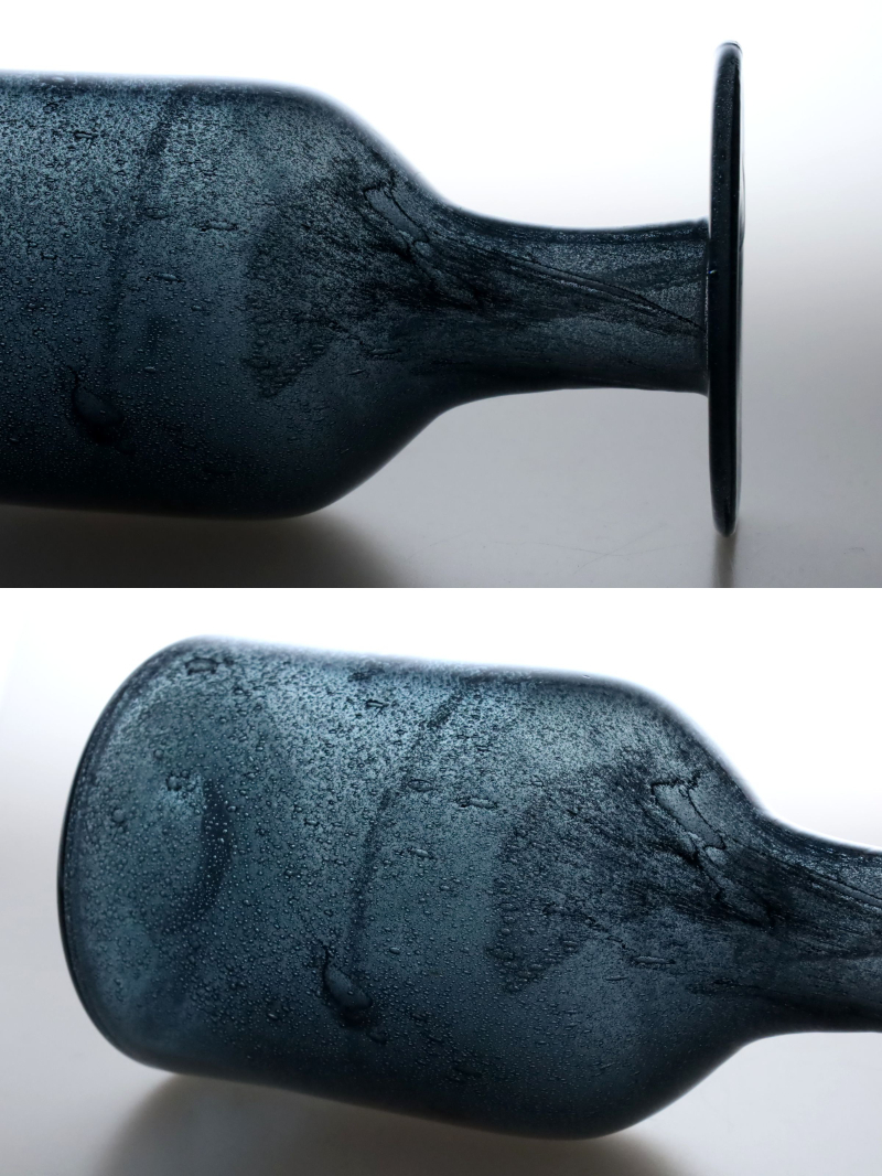 | 商品説明 | 品名:Glass Vase ベース 花瓶 デザイン:Erik Hoglund エリック・ホグラン メーカー:Boda ボダ社 製造年代:1950年代-1970年代 カラー:Blue Gray(ブルーグレー) サイズ:Φ9.3cm(底部)H19.5cm(一番高さのある部分で19.5cmです) コンディション:表面は、多少の擦れはありますが目立つものはなく綺麗です。底部は、擦れがやや目立ちます。内部は、汚れの付着はあまり見られずとても綺麗です。全体としましては、とても良いコンディションです。ガラス制作上特有の歪み、しわ、くぼみ、気泡の割れ等がある場合がございますのでご理解頂ければと思います。 細かな気泡が美しいブルーグレーのフラワーベースです。*底部にカットサインが入っています(画像5)。 |