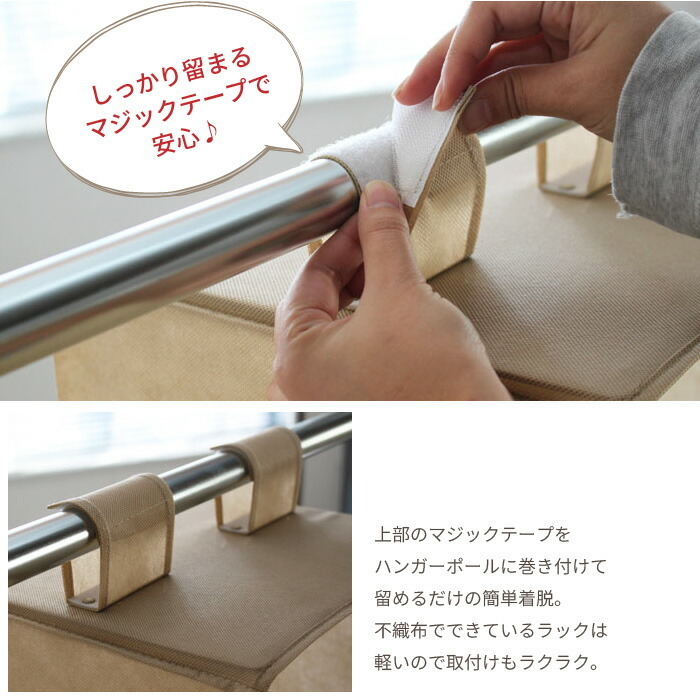 | クローゼットはハンガーラック等を有効活用できる吊り下げタイプの収納ラック。 クローゼットに吊るして、TシャツやYシャツ、セーターなどの衣服だけでなく、カバンや帽子などの収納にも最適。 クローゼットやハンガーラックのパイプにマジックテープで巻きつけるだけの簡単設置。 使わない時はコンパクトに折りたたんだ置けるので、邪魔になりません。 生地の素材は適度な吸湿性・通気性があり、軽くて扱いやすい不織布を使用しております。 |