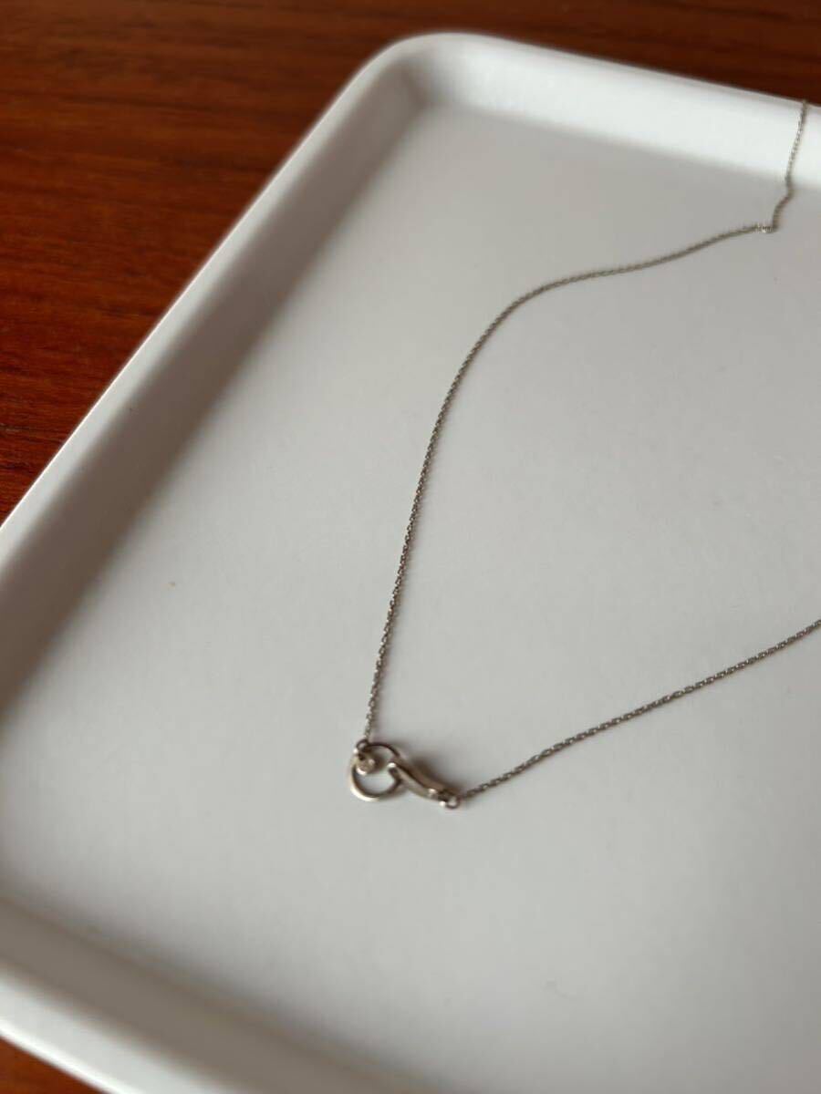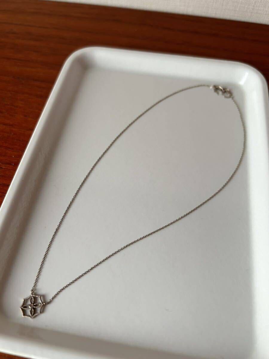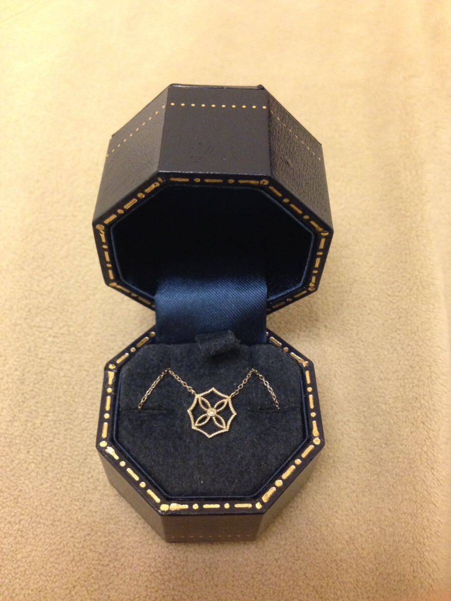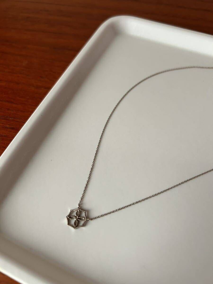 humのネックレスです。繊細なミル打ちが施されていて、花の真ん中には小さなダイヤモンドが入っています。かなり小さくですが、トップにhumの刻印、留め具にhumと750の刻印が入っています。