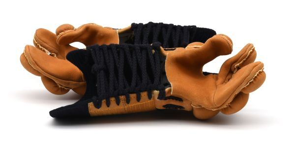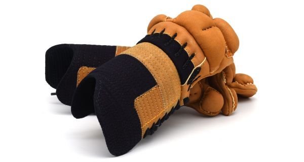 ミシン刺しながら頭・手の内共に燻した香りがたまらない茶鹿革仕立ての小手です。