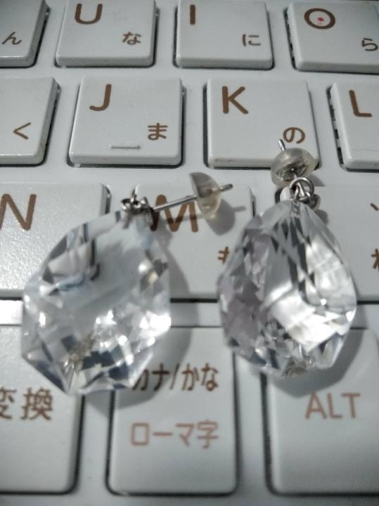 裏中央から伸びた放射線が、表面のカットを通してまばゆい光を放つ大粒ピアスです。