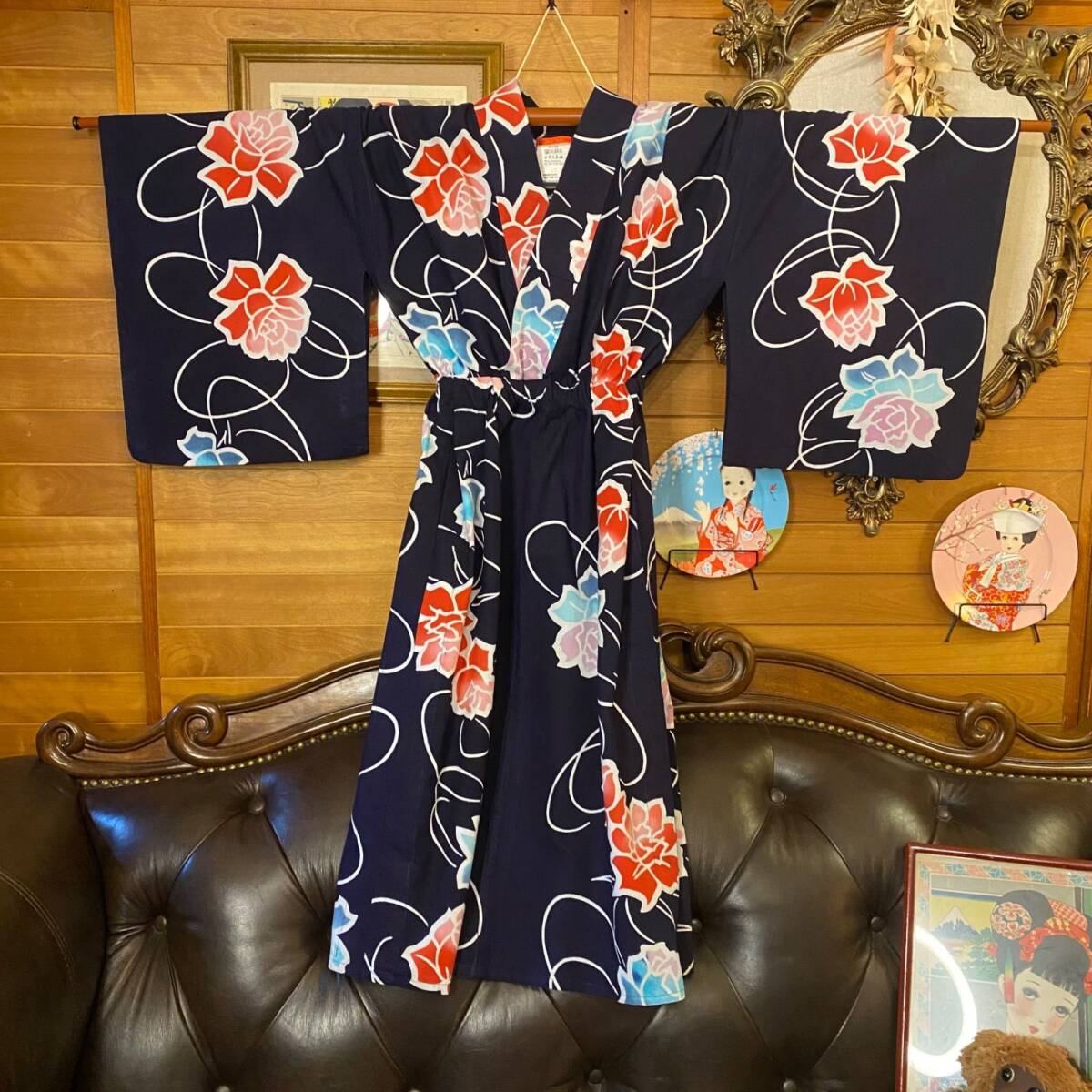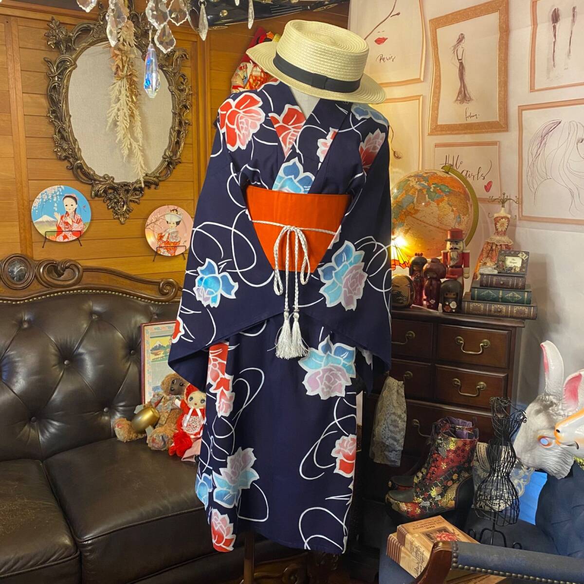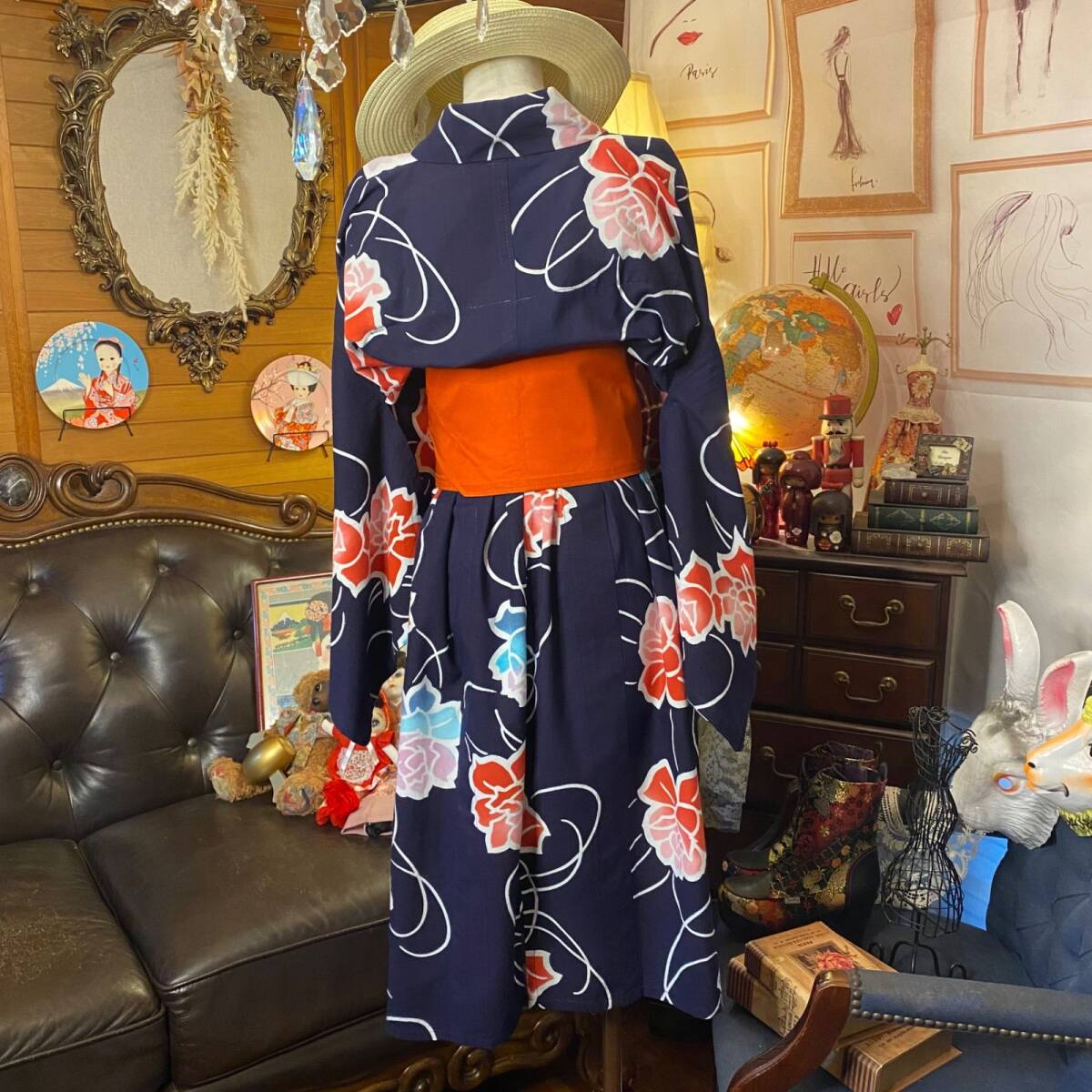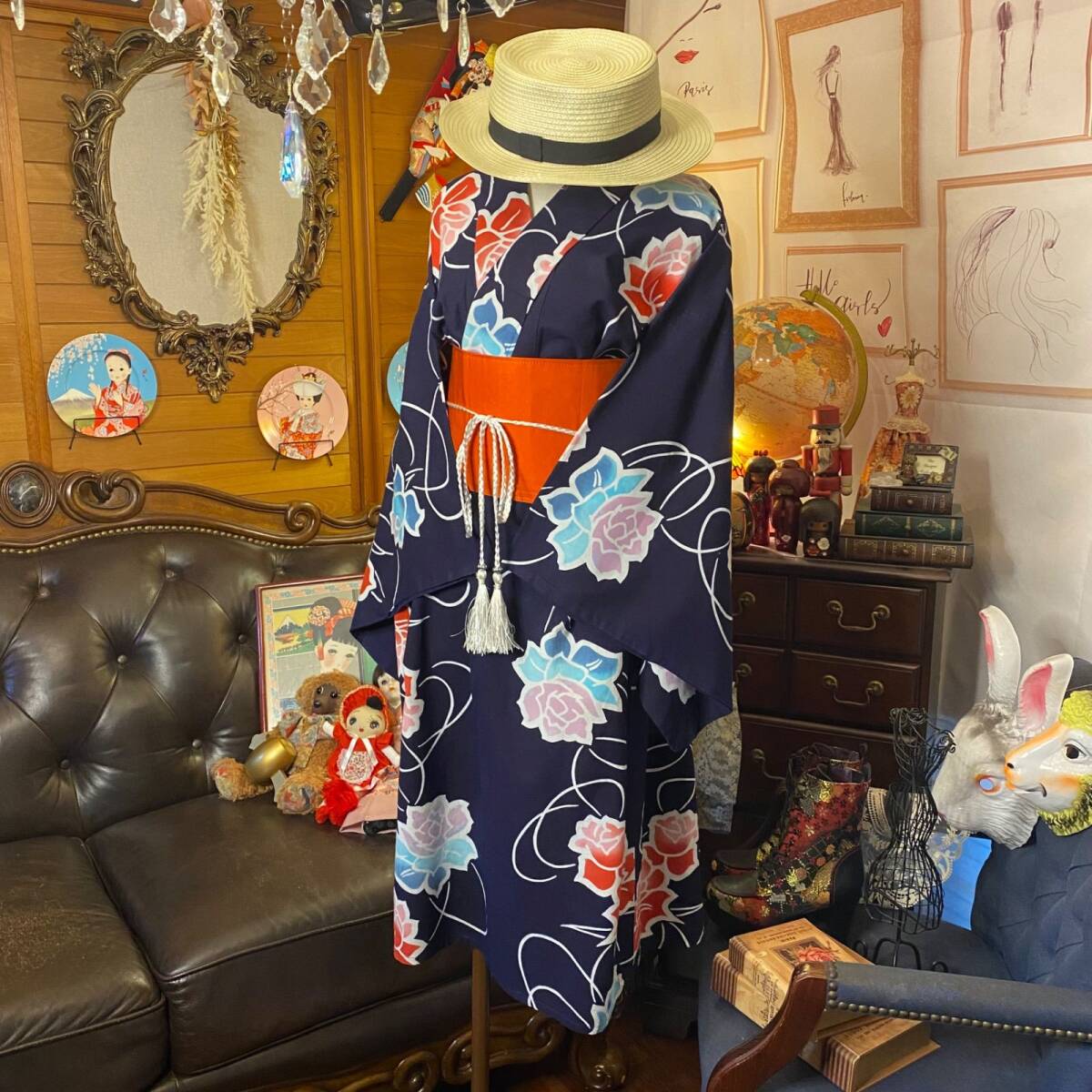 【 和洋折衷 浴衣 リメイク ワンピース ドレス 帯サッシュベルト 素敵な薔薇/ローズ W-406 】