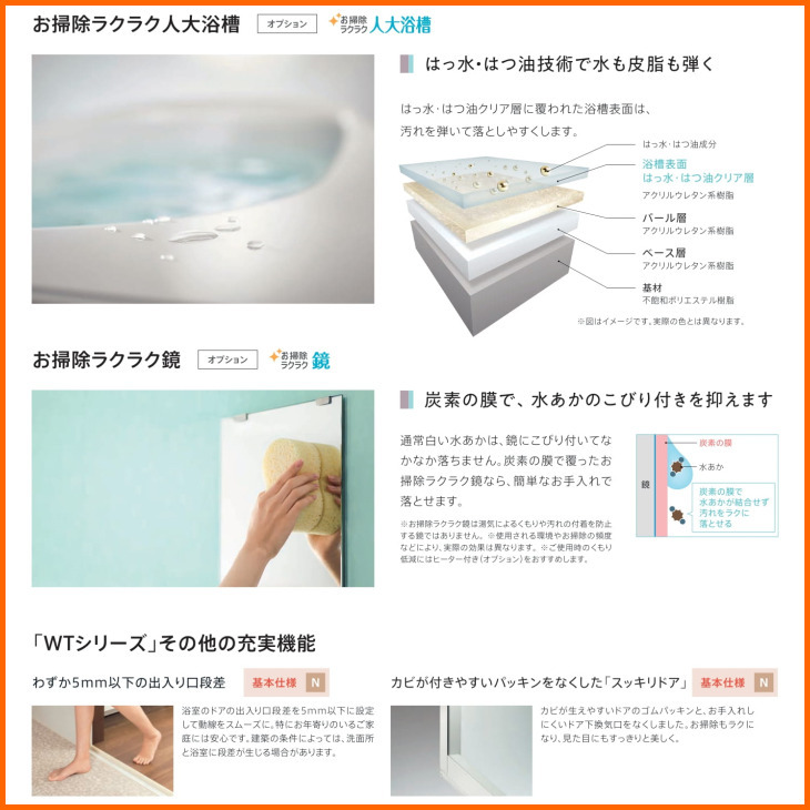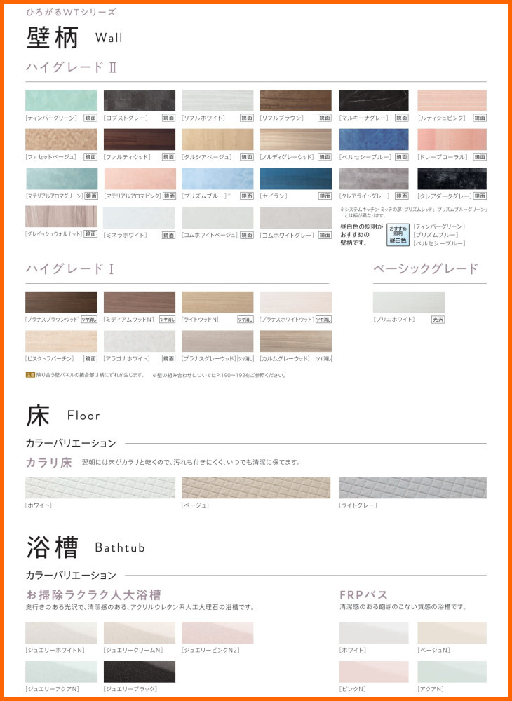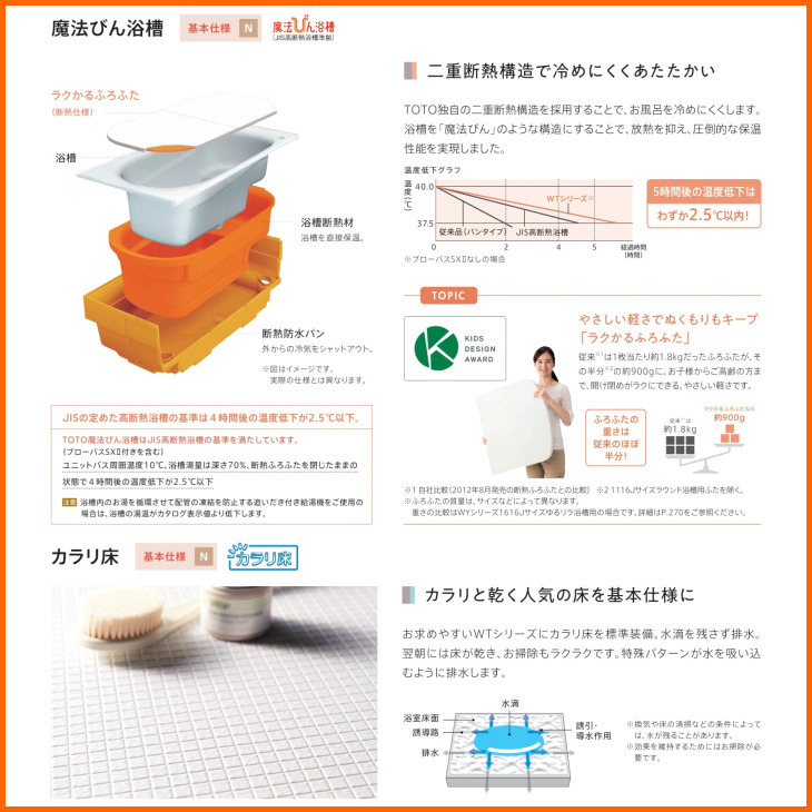 | 商品説明 | 〜WTの特長〜 ★『カラリ床』水滴を残さず排水。翌朝には床が乾き、お掃除もラクラクです。 ★『魔法びん浴槽』浴槽を断熱材ですっぽり包み込んだ、まるで魔法びんのような TOTOならではの二重断熱構造。 家族みんなの帰宅時間がまちまちでも、すぐに温かいお風呂に入れます。 残り湯を洗濯に使えば汚れの落ちも抜群。省エネ効果の高い浴槽です。 ※商品の詳細につきましてはメーカーHP・カタログでご確認願います。 ◆本タイプ以外の型・サイズもございます。 ◆ユニットバスの他、システムキッチン・洗面化粧台・トイレ等の水廻り商品も取り扱って おります。 ◆オプション等で別途お見積りが必要なケースのお問い合わせは、TEL・FAX・メールにて お気軽にどうぞ! ◆メーカーの定価見積書からもお買い求め頂けます。 事前にご連絡の上、FAXまたはメールにてお送り下さい。 弊社価格の見積書を作成致します。 ◆サイズ違い等、ショップ上に掲載されていない商品をご希望の方はお問い合わせ下さい。 ⇒ クリックで”WEBカタログ”にリンクします |