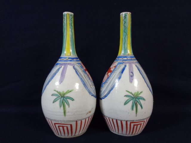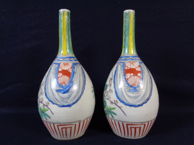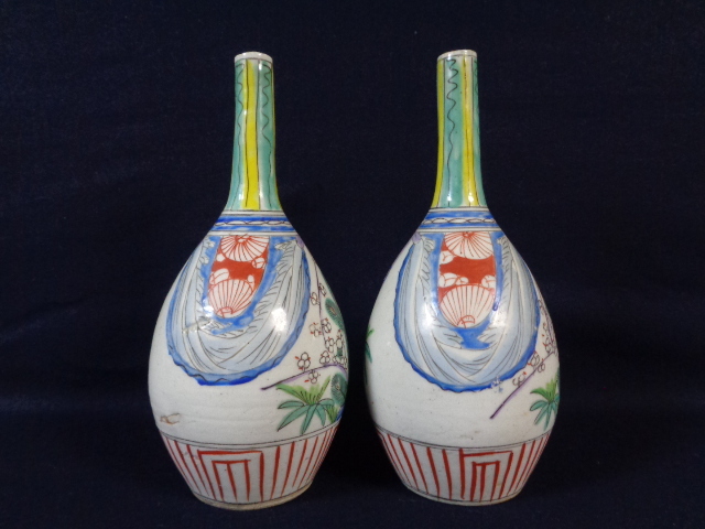 古伊万里 色絵鶴首徳利 お神酒徳利 一対 神棚 花器 一輪挿し 明治期