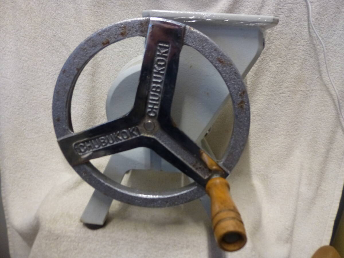 市場での買い受け品です。 メッキ部やフレームに錆燈はありますが、コンディションはまずまずかと思います。 上部蓋はありませんが、板かなんかで代用できますし、投入口が大きいのでコンビニ等で売っているロック氷などそのまま入れれます。 居酒屋やバー、小さいお店などでいかがでしょうか? おおよそのサイズですが、投入口 外径サイズ16.3㎝×16.3㎝ 内径13㎝×12.5㎝、全体の高さ 約30㎝となります。 |