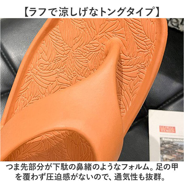 | 商品説明 | ・・夏のお出かけやレジャー、アウトドアなどで活躍!サッと履ける「フリップサンダル」が新登場。 ・【ラフで涼しげなトングタイプ】 ・つま先部分が下駄の鼻緒のようなフォルム。足の甲を覆わず圧迫感がないので、通気性も抜群。 ・【履き心地軽やかでストレスフリー】 ・足に負担がかかりにくい軽量設計。長時間履いていても疲れにくいのが嬉しい◎ ・【足に優しく心地よいフィット感】 ・柔らかなEVA素材を使った一体成型仕様。素足でも快適な履き心地。 ・【雨の日も夏のレジャーでも】 ・水に強く、プールや海水浴などのレジャーシーンではビーチサンダルとして♪ ・【足裏を受け止めるインソール】 ・足にかかる負担を軽減する、低反発のソフトインソール。表面の柄もおしゃれ☆ ・【屈曲性があり、歩きやすさが向上】 ・つま先部分が足の動きに合わせて曲がり、上を向いたつくり。つまづきにくく蹴り上げやすい! ・【衝撃を吸収し、安定感のあるソール】 ・程よい厚みのソールが、足にかかる衝撃をガード。フラットで安定感のある歩行をサポート。 ・【ギザギザ凹凸のアウトソール】 ・滑りを抑えるアウトソール。安全面にも配慮◎ ・【幅広いコーデに素敵にマッチ】 ・スポーティースタイルや、デニムなどのカジュアルコーデにも!デイリーに使えるアイテム。 ・【お揃いで履けるユニセックス仕様】 ・シンプルなワンカラーで仕上げた、ジェンダーレスデザイン。仲良くお揃いにできるサイズ展開。 |