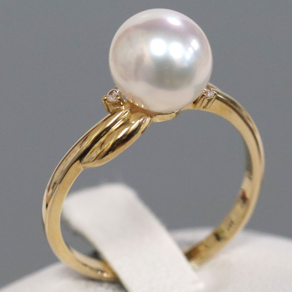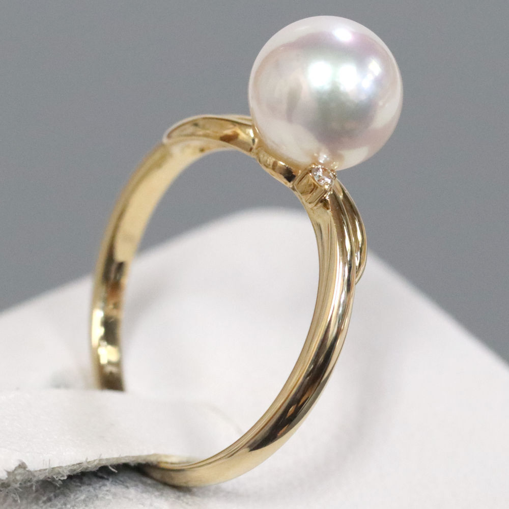 | タサキのK18パールダイヤモンドリングの中古品です。 約7.8mmのパールがセットされております。 パールは照りが良いです。 サイドに小振りなダイヤモンドが2ポイントセットされております。 地金に小傷があります。