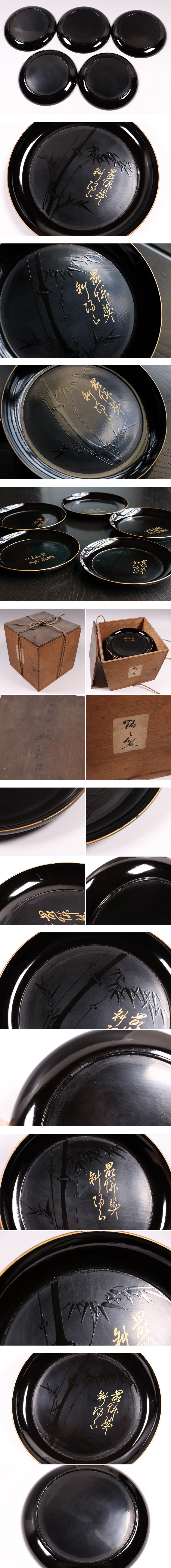 ◇木製漆器 時代物 竹図 闇蒔絵 金蒔絵 黒塗銘々盆 十九客 15.8cm 木皿 菓子皿 木箱入り MA17◇