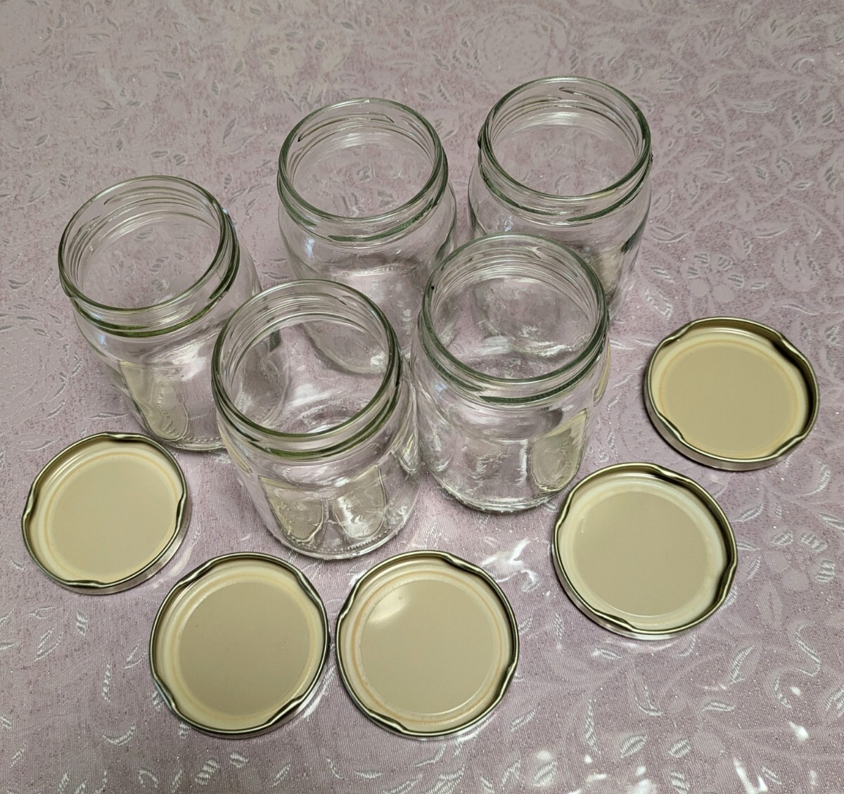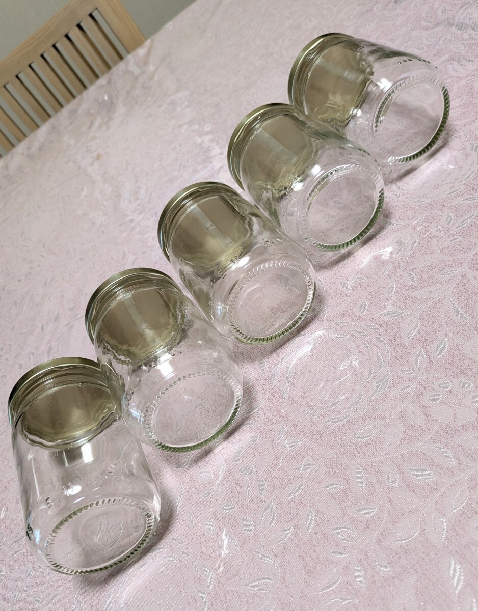 はちみつが入っていた蓋付きガラス瓶5個セットです。