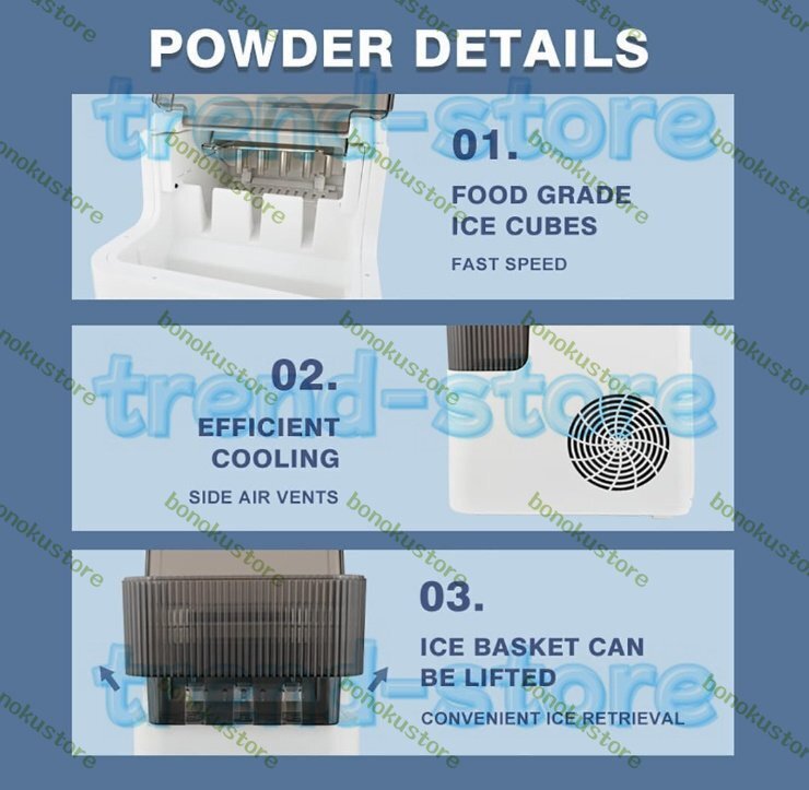 静かな製氷この製氷機は低デシベル騒音で動作するため、静かな製氷プロセスをお楽しみください。半透明の蓋で氷の生成を監視でき、アイスバスケットがいっぱいになるとセンサーが自動的に検出してオーバーフローを防ぎます。
