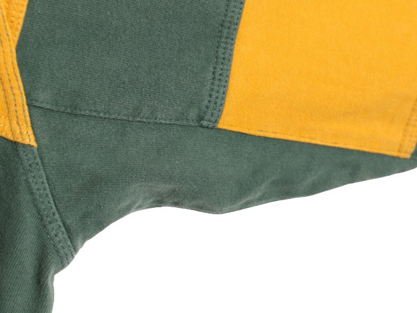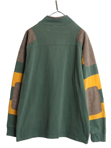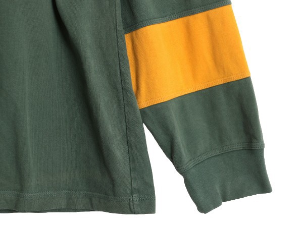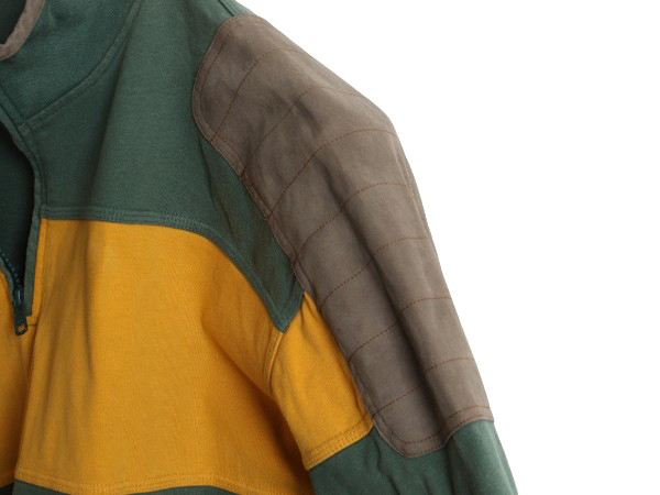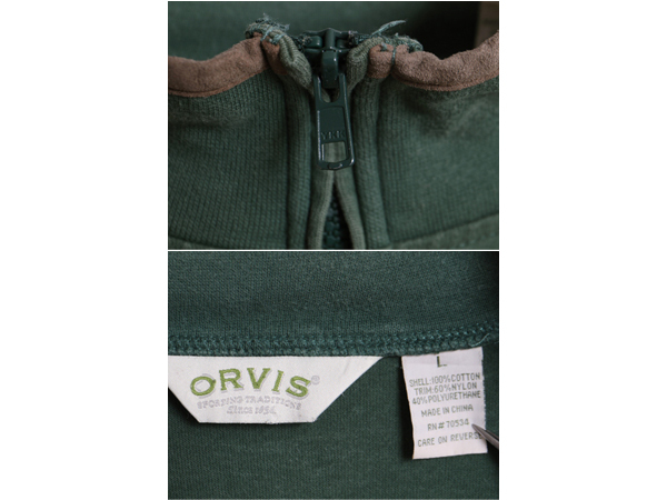 00年代のオールド 旧タグ オービスの 長袖Tシャツです。 ORVIS社は、アメリカで1856年に設立され、 150年以上の歴史あるフィッシング アウトドア用品で有名な会社です。 素材は、100% COTTON ( コットン ) しっかりとした厚手の ヘビーウェイト ラガーシャツ素材が使用されています。 TRIM 60% NYLON 40% POLYURETHANE 首回りのパイピング、肩のショルダーパッチ 両肘のエルボーパッチは 本革 スウェードレザー調の補強入り 自宅洗濯可能素材で取り扱いもしやすい素材です フロントはYKKジップを使用 ハイネックタイプ、襟を高く設定することによって 首周りの保温力も高くなっています。 脇に動きやすさを提供するガゼット 堅牢なトリプルステッチ縫製 グリーン x マスタード イエローの好配色 ツートーン切替 ゆったりとした人気のシルエット 老舗ブランドの手掛けたしっかりとした作り まったく見かけないオールド オービスのグッドデザイン 1枚で様になる着回しのきく商品です。 |