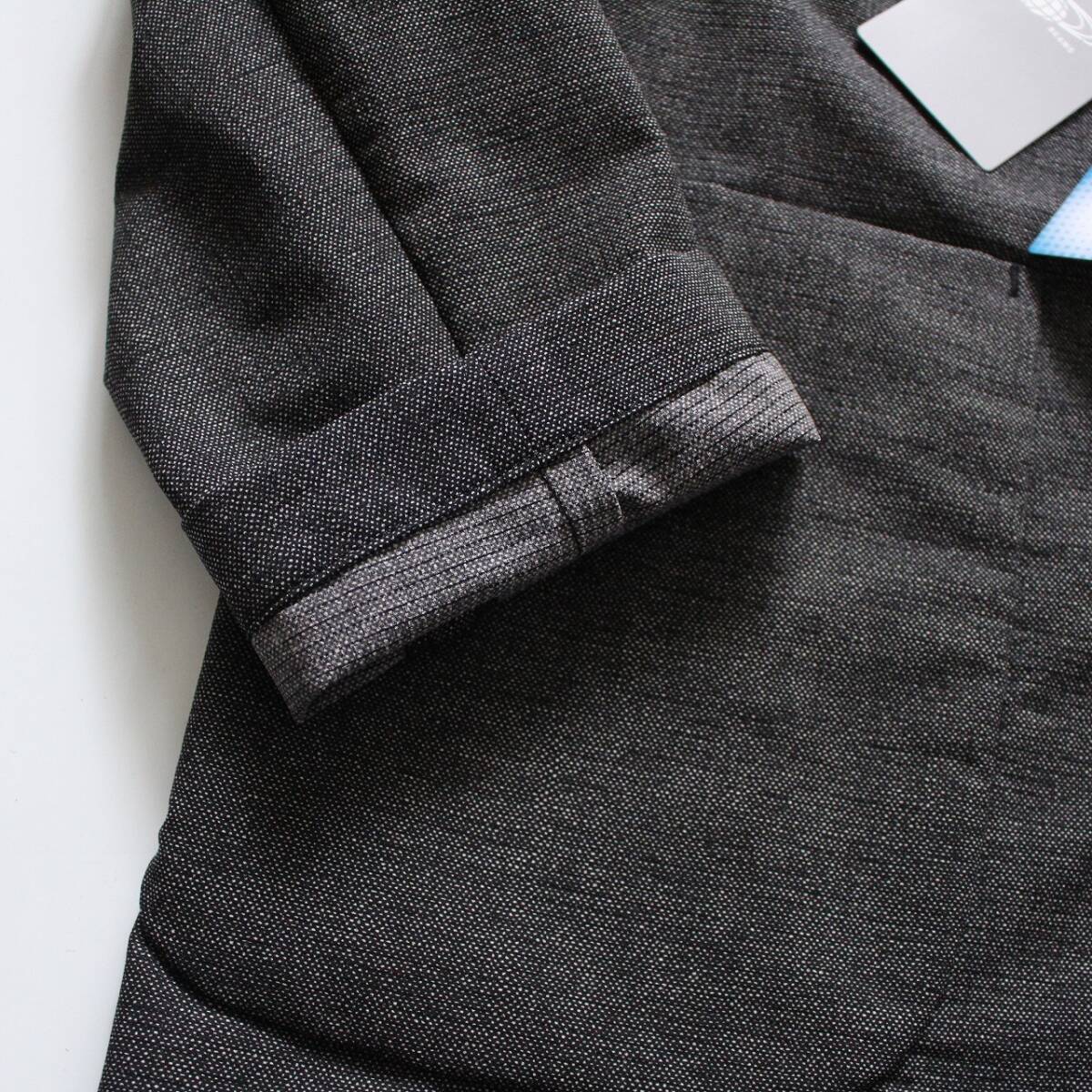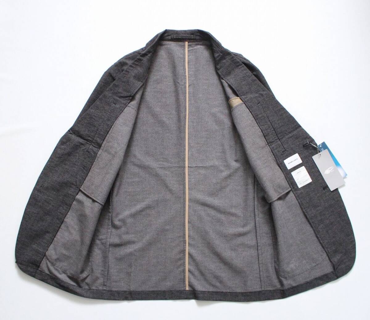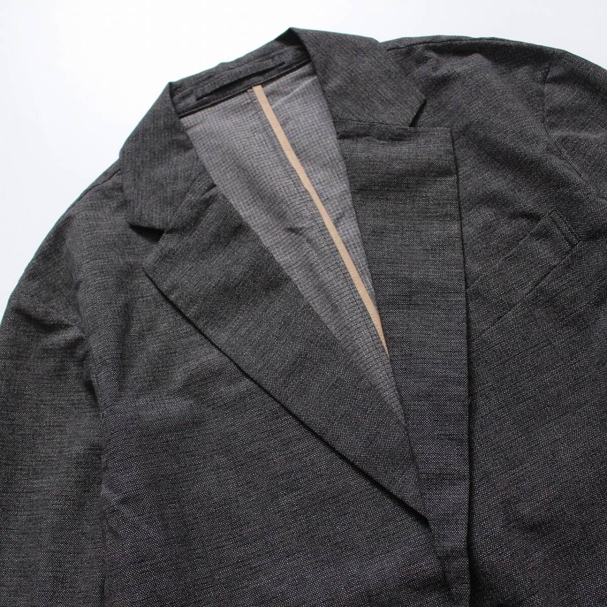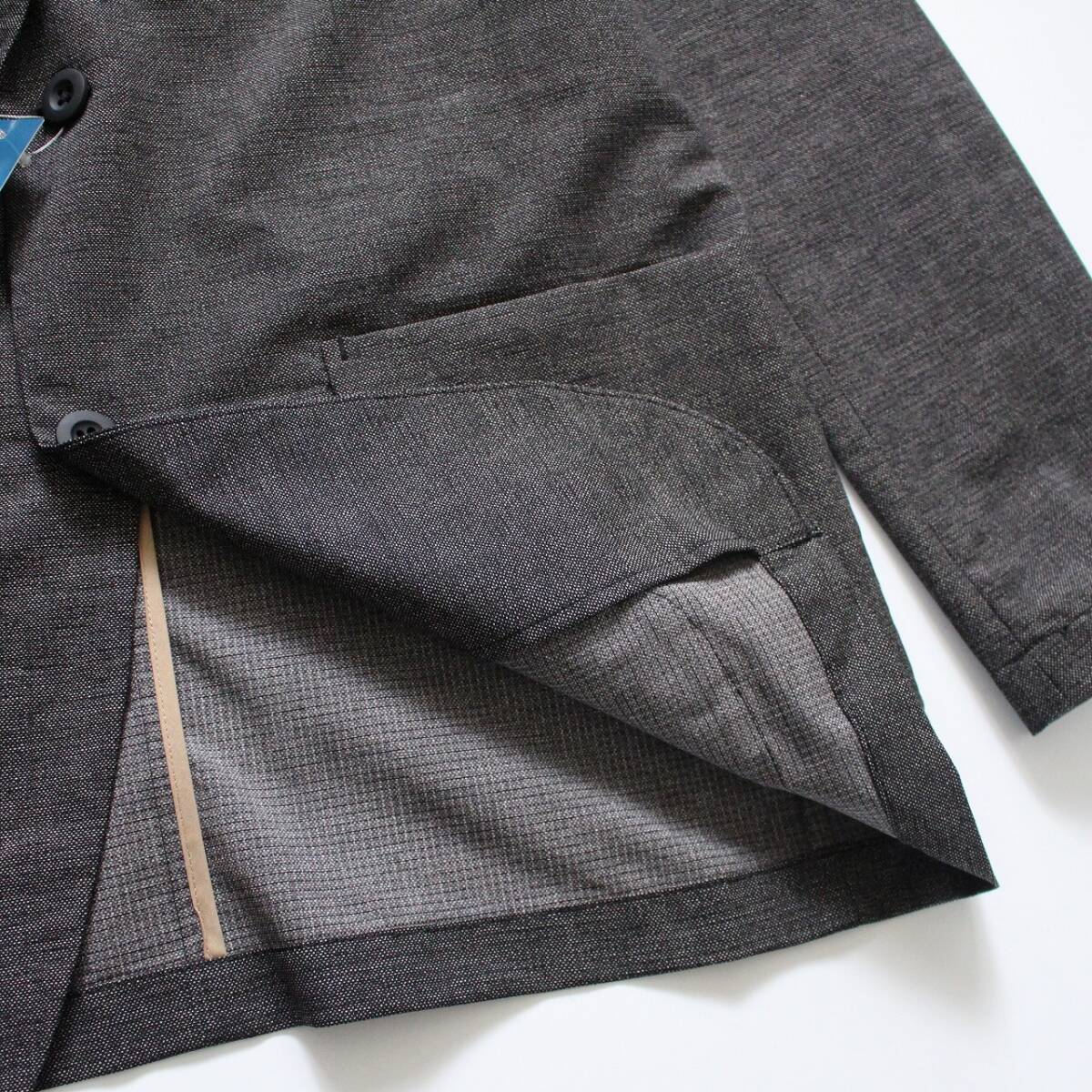 軽量で薄手の素材で、前は2つボタン、ノーベント、ポケットは前に3つ、内ポケ2つです。