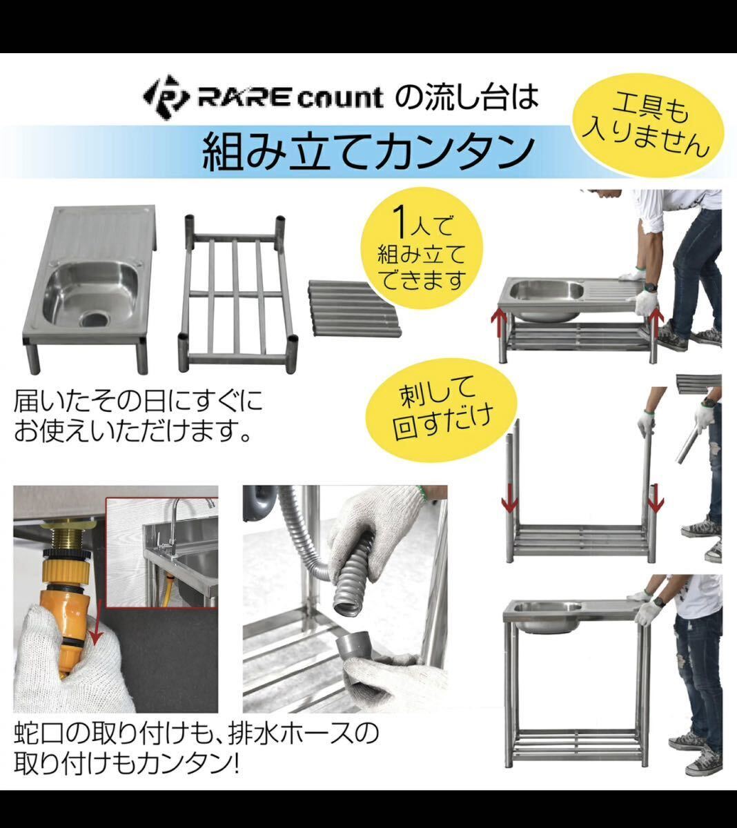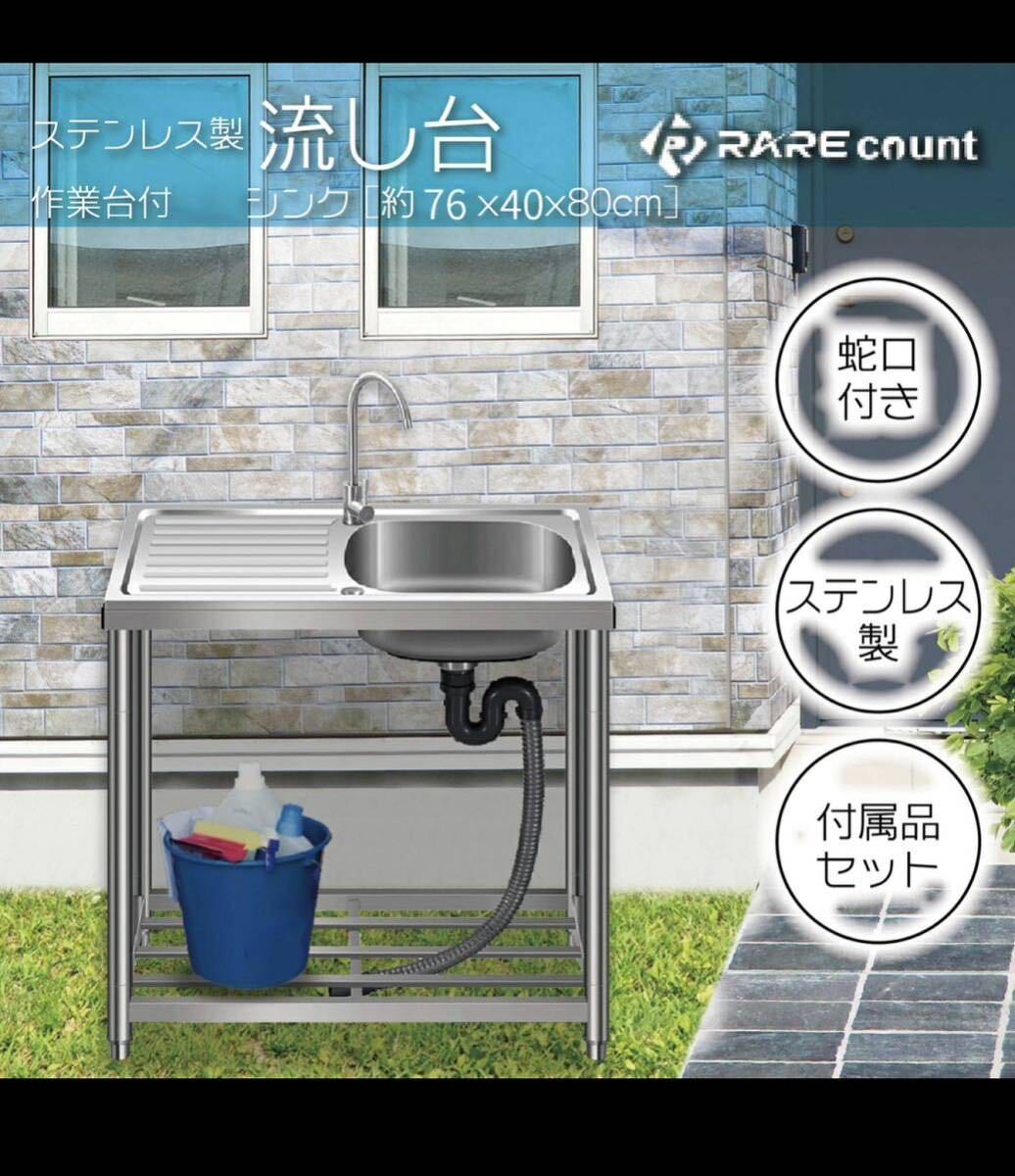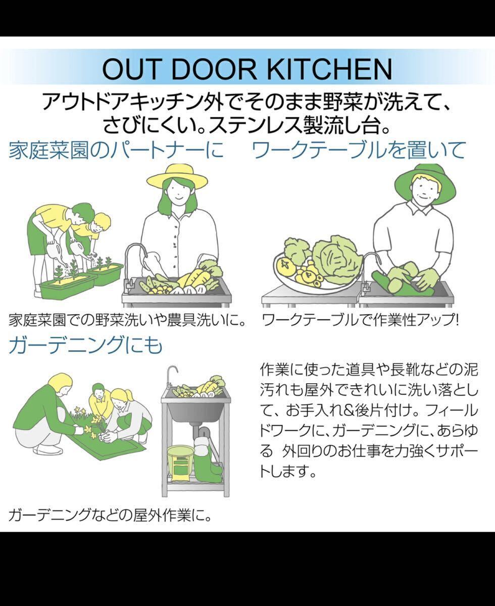 * 庭先やベランダ、アウトドア、キャンプ、工事現場など活躍の場は様々。お庭でのガーデニングやBBQなどで活躍する流し台。サビに強いステンレス製なので,屋外でも安心して使える。蛇口付きで台所に近い感覚で使え,深型シンクと作業台もあるため,用具の水洗いや野菜洗いなどに。
