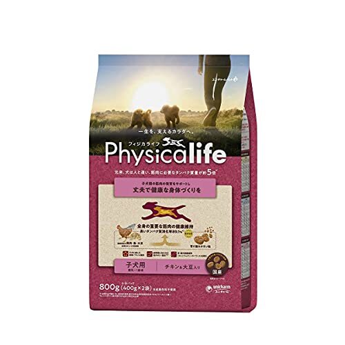 「ユニ・チャーム Physicalife(フィジカライフ) 子犬用 離乳~1歳頃 チキン&大豆入り 800g」▼4520699654439▼(商品説明)・ 800グラム (x 1) ・子犬期の全身の重要な筋肉の健康を維持するために、厳選素材の鶏肉・魚・大豆由来のタンパク質をバランスよく豊富に含み、胃で崩れやすい粒により、タンパク質消化率89.1%を実現(分析値代表例 ユニ・チャーム調べ)・12ヶ月頃までの子犬に適した栄養バランス設計・成長期に合わせた高カロリー設計(フィジカライフ成犬用比100gあたり約20kcal増)・骨・歯の健康維持のためにカルシウム・リンをバランスよく調整、ミルクカルシウム配合説明 子犬期の全身の重要な健康な筋肉を維持するために、厳選素材の鶏肉・魚・大豆由来のタンパク質をバランスよく豊富に含み、胃で崩れやすい粒により、89.1%と高いタンパク質消化率を実現(特許取得)。丈夫で健康な身体つくりをサポートし、よく食べてよく遊ぶ楽しい毎日が続きます。
