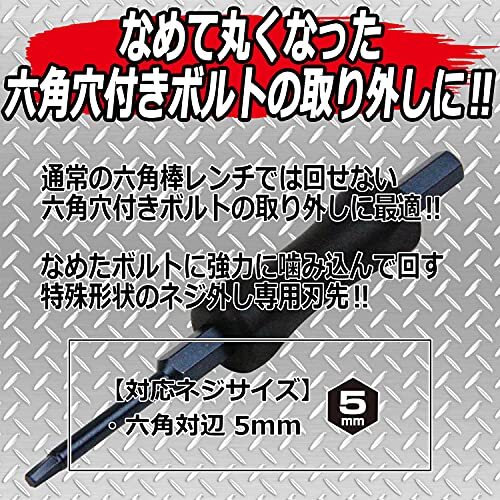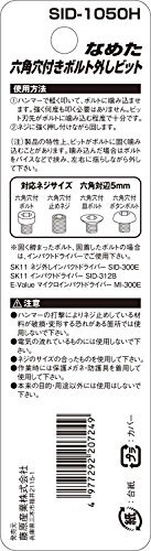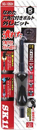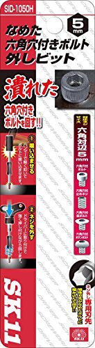 「SK11 なめた六角穴付ボルト外しビット 対応ネジサイズ六角対辺5mm SID-1050H」▼4977292207249▼(商品説明)・ 六角対辺5mm SID-1050H・・Size:六角対辺5mm・用途:なめて丸くなった六角穴付きボルトの取り外し・特徴1:通常の六角棒レンチで回せない六角穴付きボルトを回せるビット・特徴2:特殊刃形状がなめたボルトに強力に噛み込んで回す・対応サイズ:六角対辺5mm・入数:1個説明 通常の六角棒レンチで回せない六角穴付きボルトを回せるビット 【用途】 なめて丸くなった六角穴付きボルトの取り外し 【特徴】 ・特殊刃形状がなめたボルトに強力に噛み込んで回す 【注意事項】 ※ハンマーの打撃によりネジ止めしている材料が破損・変形する恐れがある箇所では使用しないで下さい。 ※電気の流れているものには使用しないで下さい。 ※ネジのサイズの合ったものを使用して下さい。 ※作業時には保護メガネ・防護具を着用して使用して下さい。 ※本来の目的・用途以外には使用はしないで下さい。