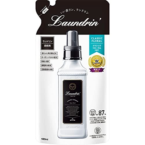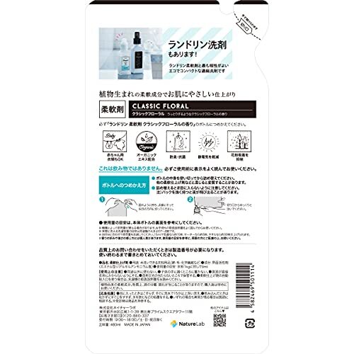 「ランドリン 柔軟剤 クラシックフローラル 詰め替え 480ml」▼4582469501114▼(商品説明)・ 480ミリリットル (x 1) ・・PatternName:詰め替え480ml・商品サイズ (幅×奥行×高さ) :130mm×40mm×250mm・原産国:日本・内容量:480ml・内容量:480ml説明 商品紹介 【ランドリンの香り人気No.1 *メーカー調べ】 うっとりするような優雅な気分をイメージした上品でクラシカルな香りが持続する柔軟剤です。 お肌にやさしい低刺激処方。静電気を軽減します。 花粉吸着を抑制します。抗菌・防臭。つめかえ用 ランドリン クラシックフローラルの香り 年間売上NO.1 ※TrueData調べ 柔軟剤香り別年間売上ランキング(2019年1月~12月) 使用上の注意 ●用途以外に使用しない。 ●子供の手に届くところに置かない。 ●原液が直接衣料にかからないようにする。 ●直射日光の当たらないところで保管する。 ●柔軟仕上げ剤の自動投入口を使う場合は、洗濯機の取扱説明書をお読みください。・原材料・成分 界面活性剤(エステル型ジアルキルアンモニウム塩)