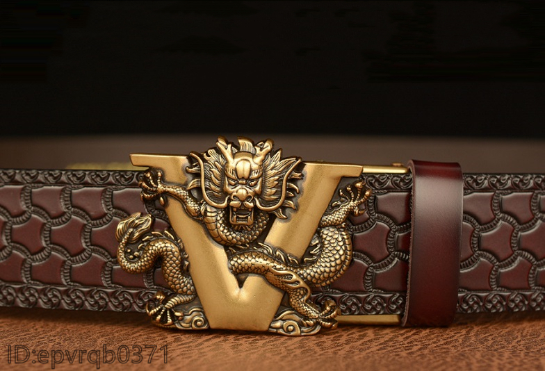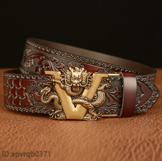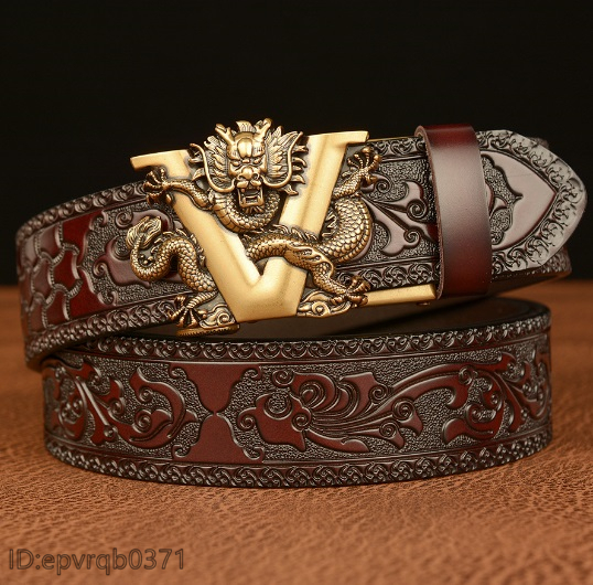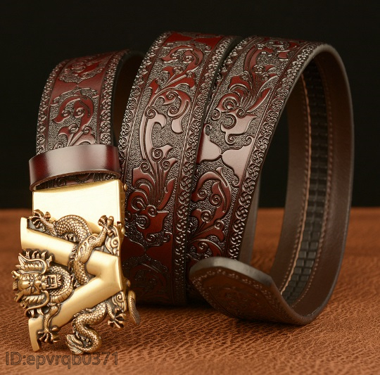 レザーベルト※新品 オートロック式 バックル ドラゴン龍 本革 メンズベ ルト 幅3.5センチ 柄物 紳士 長さ調整可能 /茶色