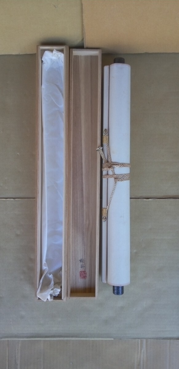 木箱の中で、長期間保管された掛軸だと思います。 撮影・チェックの為、木箱より取り出ししています。 目立った割れや破れ・破損等は無さそうです。